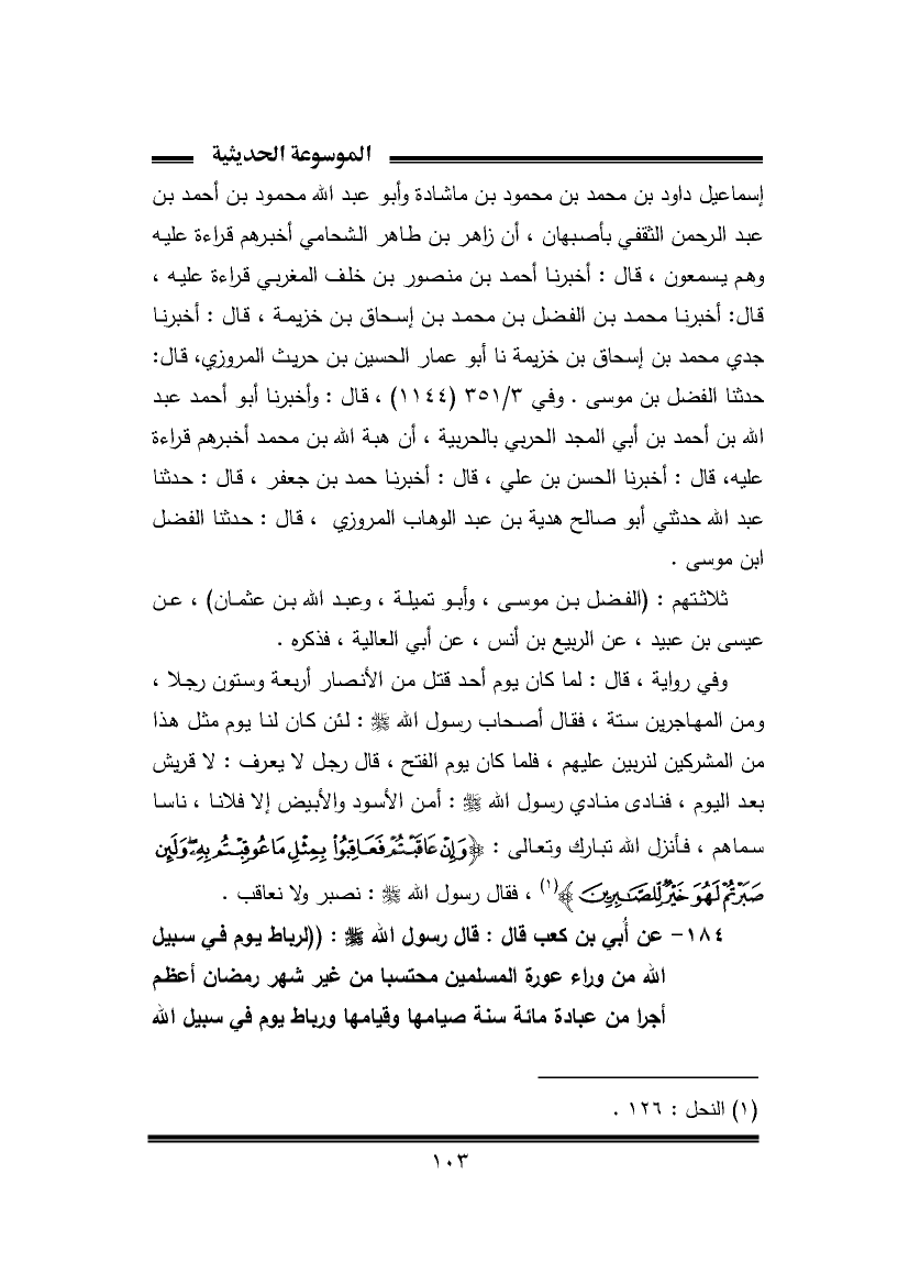 إسماعيل داود بن محمد بن محمود بن ماشادة وأبو عبد الله محمود بن أحمد بن عبد الرحمن الثقفي بأصبهان، أن زاهر بن طاهر الشحامي أخبرهم قراءة عليه وهم يسمعون، قال: أخبرنا أحمد بن منصور بن خلف المغربي قراءة عليه، قال: أخبرنا محمد بن الفضل بن محمد بن إسحاق بن خزيمة، قال: أخبرنا جدي محمد بن إسحاق بن خزيمة نا أبو عمار الحسين بن حريث المروزي، قال: حدثنا الفضل بن موسى. وفي ٣/ ٣٥١ (١١٤٤)، قال: وأخبرنا أبو أحمد عبد الله بن أحمد بن أبي المجد الحربي بالحربية، أن هبة الله بن محمد أخبرهم قراءة عليه، قال: أخبرنا الحسن بن علي، قال: أخبرنا حمد بن جعفر، قال: حدثنا عبد الله حدثني أبو صالح هدية بن عبد الوهاب المروزي، قال: حدثنا الفضل بن موسى.