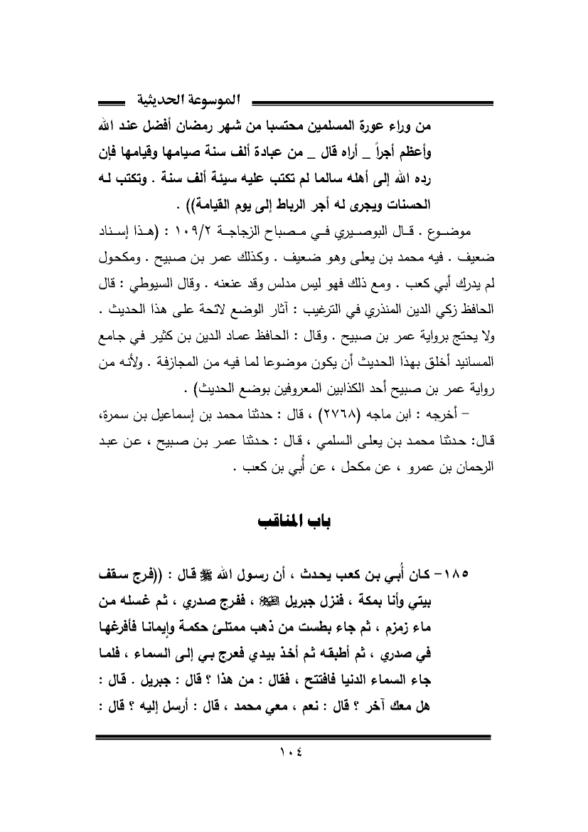 ١٨٥ - كان أُبي بن كعب يحدث، أن رسول الله - صلى الله عليه وسلم - قال: "فرج سقف بيتي وأنا بمكة، فنزل جبريل عليه السلام، ففرج صدري، ثم غسله من ماء زمزم، ثم جاء بطست من ذهب ممتلئ حكمة وإيمانا فأفرغها في صدري، ثم أطبقه ثم أخذ بيدي فعرج بي إلى السماء، فلما جاء السماء الدنيا فافتتح، فقال: من هذا؟ قال: جبريل. قال: هل معك آخر؟ قال: نعم، معي محمد، قال: أرسل إليه؟ قال: