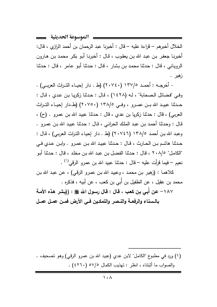 ١٨٧ - عن أُبي بن كعب، قال: قال رسول الله - صلى الله عليه وسلم -: "بشر هذه الأمة بالسناء والرفعة والنصر والتمكين في الأرض فمن عمل عمل