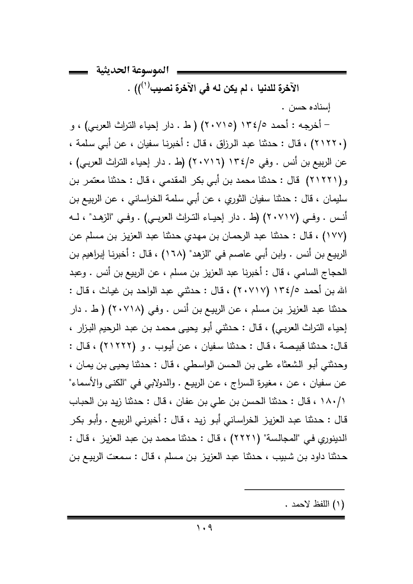 - أخرجه: أحمد ٥/ ١٣٤ (٢٠٧١٥) (ط. دار إحياء التراث العربي)، و (٢١٢٢٠)، قال: حدثنا عبد الرزاق، قال: أخبرنا سفيان، عن أبي سلمة، عن الربيع بن أنس. وفي ٥/ ١٣٤ (٢٠٧١٦) (ط. دار إحياء التراث العربي)، و (٢١٢٢١) قال: حدثنا محمد بن أبي بكر المقدمي، قال: حدثنا معتمر بن سليمان، قال: حدثنا سفيان الثوري، عن أبي سلمة الخراساني، عن الربيع بن أنس. وفي (٢٠٧١٧) (ط. دار إحياء التراث العربي). وفي "الزهد"، له (١٧٧)، قال: حدثنا عبد الرحمان بن مهدي حدثنا عبد العزيز بن مسلم عن الربيع بن أنس. وابن أبي عاصم في "الزهد" (١٦٨)، قال: أخبرنا إبراهيم بن الحجاج السامي، قال: أخبرنا عبد العزيز بن مسلم، عن الربيع بن أنس. وعبد الله بن أحمد ٥/ ١٣٤ (٢٠٧١٧)، قال: حدثني عبد الواحد بن غياث، قال: حدثنا عبد العزيز بن مسلم، عن الربيع بن أنس. وفي (٢٠٧١٨) (ط. دار إحياء التراث العربي)، قال: حدثني أبو يحيى محمد بن عبد الرحيم البزار، قال: حدثنا قبيصة، قال: حدثنا سفيان، عن أيوب. و (٢١٢٢٢)، قال: وحدثني أبو الشعثاء على بن الحسن الواسطي، قال: حدثنا يحيى بن يمان، عن سفيان، عن، مغيرة السراج، عن الربيع. والدولابي في "الكنى والأسماء" ١/ ١٨٠، قال: حدثنا الحسن بن علي بن عفان، قال: حدثنا زيد بن الحباب قال: حدثنا عبد العزيز الخراساني أبو زيد، قال: أخبرني الربيع. وأبو بكر الدينوري في "المجالسة" (٢٢٢١)، قال: حدثنا محمد بن عبد العزيز، قال: حدثنا داود بن شبيب، حدثنا عبد العزيز بن مسلم، قال: سمعت الربيع بن