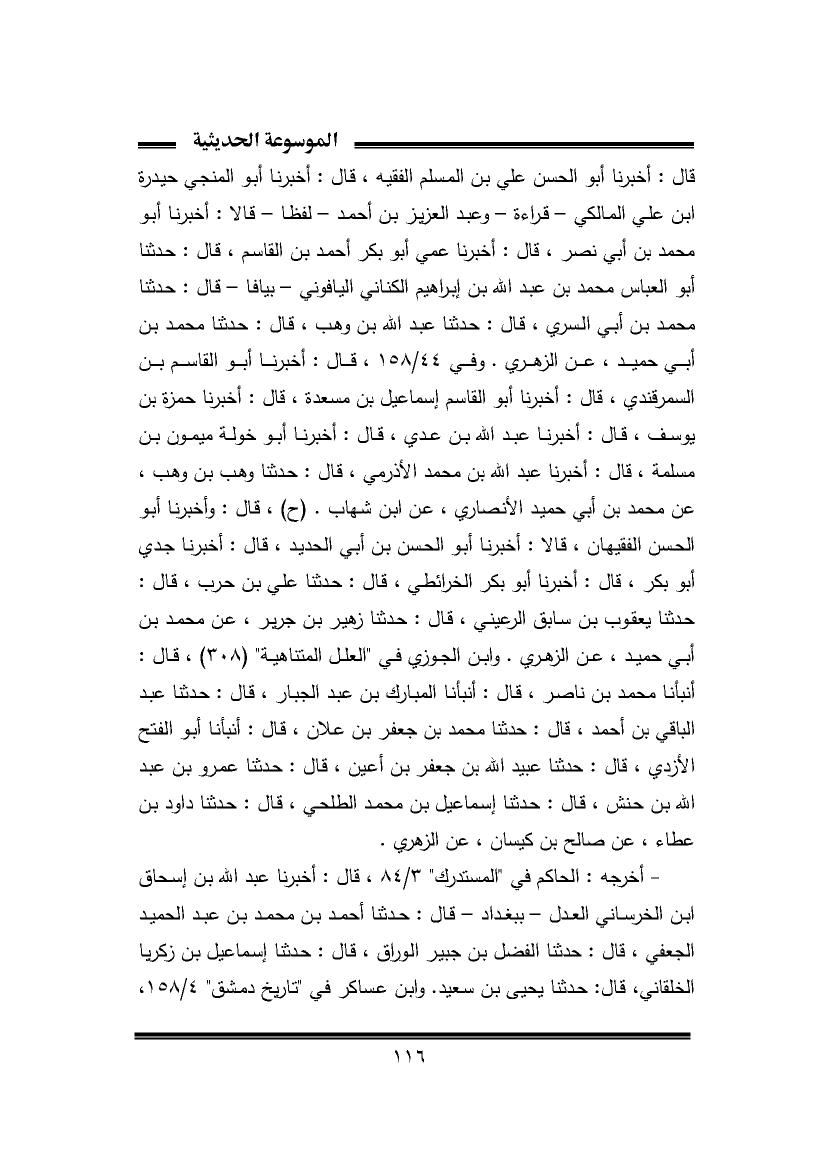 قال: أخبرنا أبو الحسن علي بن المسلم الفقيه، قال: أخبرنا أبو المنجي حيدرة بن علي المالكي - قراءة - وعبد العزيز بن أحمد - لفظا - قالا: أخبرنا أبو محمد بن أبي نصر، قال: أخبرنا عمي أبو بكر أحمد بن القاسم، قال: حدثنا أبو العباس محمد بن عبد الله بن إبراهيم الكناني اليافوني - بيافا - قال: حدثنا محمد بن أبي السري، قال: حدثنا عبد الله بن وهب، قال: حدثنا محمد بن أبي حميد، عن الزهري. وفي ٤٤/ ١٥٨، قال: أخبرنا أبو القاسم بن السمرقندي، قال: أخبرنا أبو القاسم إسماعيل بن مسعدة، قال: أخبرنا حمزة بن يوسف، قال: أخبرنا عبد الله بن عدي، قال: أخبرنا أبو خولة ميمون بن مسلمة، قال: أخبرنا عبد الله بن محمد الأذرمي، قال: حدثنا وهب بن وهب، عن محمد بن أبي حميد الأنصاري، عن ابن شهاب. (ح)، قال: وأخبرنا أبو الحسن الفقيهان، قالا: أخبرنا أبو الحسن بن أبي الحديد، قال: أخبرنا جدي أبو بكر، قال: أخبرنا أبو بكر الخرائطي، قال: حدثنا علي بن حرب، قال: حدثنا يعقوب بن سابق الرعيني، قال: حدثنا زهير بن جرير، عن محمد بن أبي حميد، عن الزهري. وابن الجوزي في "العلل المتناهية" (٣٠٨)، قال: أنبأنا محمد بن ناصر، قال: أنبأنا المبارك بن عبد الجبار، قال: حدثنا عبد الباقي بن أحمد، قال: حدثنا محمد بن جعفر بن علان، قال: أنبأنا أبو الفتح الأزدي، قال: حدثنا عبيد الله بن جعفر بن أعين، قال: حدثنا عمرو بن عبد الله بن حنش، قال: حدثنا إسماعيل بن محمد الطلحي، قال: حدثنا داود بن عطاء، عن صالح بن كيسان، عن الزهري.