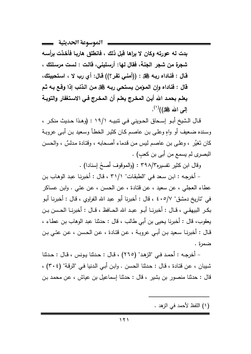 قال الشيخ أبو إسحاق الحويني في تنبيه ١/ ١٩: (وهذا حديث منكر، وسنده ضعيف أو واهٍ وعلى بن عاصم كان كثير الخطأ وسعيد بن أبى عروبة كان تَغيَّر، وعلى بن عاصم ليس من قدماء أصحابه، وقتادة مدلسٌ، والحسن البصرى لم يسمع من أُبي بن كعبٍ).