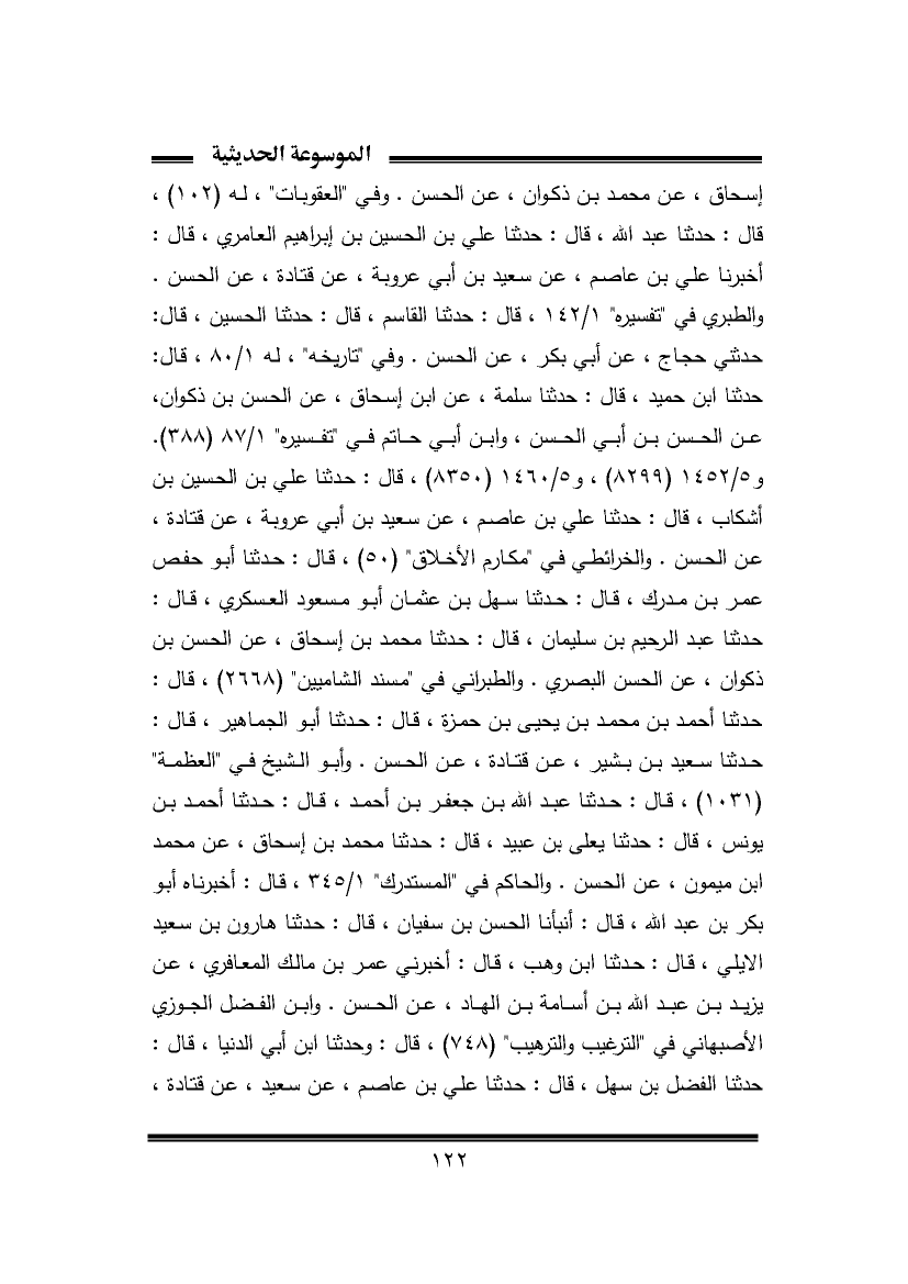إسحاق، عن محمد بن ذكوان، عن الحسن. وفي "العقوبات"، له (١٠٢)، قال: حَدَّثَنَا عبد الله، قال: حَدَّثَنَا علي بن الحسين بن إبراهيم العامري، قال: أخبرنا علي بن عاصم، عن سعيد بن أبي عوبة، عن قتادة، عن الحسن. والطبري في "تفسيره" ١/ ١٤٢، قال: حَدَّثَنَا القاسم، قال: حَدَّثَنَا الحسين، قال: حدثنا حجاج، عن أبي بكر، عن الحسن. وفي "تاريخه"، له ١/ ٨٠، قال: حَدَّثَنَا ابن حميد، قال: حَدَّثَنَا سلمة، عن ابن إسحاق، عن الحسن بن ذكوان، عن الحسن بن أبي الحسن، وابن أبي حاتم في "تفسيره" ١/ ٨٧ (٣٨٨). و ٥/ ١٤٥٢ (٨٢٩٩)، و ٥/ ١٤٦٠ (٨٣٥٠)، قال: حَدَّثَنَا علي بن الحسين بن أشكاب، قال: حَدَّثَنَا علي بن عاصم، عن سعيد بن أبي عوبة، عن قتادة، عن الحسن. والخرائطي في "مكارم الأخلاق" (، ٥)، قال: حَدَّثَنَا أبو حفص عمر بن مدرك، قال: حَدَّثَنَا سهل بن عثمان أبو مسعود العسكري، قال: حَدَّثَنَا عبد الرحيم بن سليمان، قال: حَدَّثَنَا محمد بن إسحاق، عن الحسن بن ذكوان، عن الحسن البصري. والطبراني في "مسند الشاميين" (٢٦٦٨)، قال: حَدَّثَنَا أحمد بن محمد بن يحيى بن حمزة، قال: حَدَّثَنَا أبو الجماهير، قال: حَدَّثَنَا سعيد بن بشير، عن قتادة، عن الحسن. وأبو الشيخ في "العظمة" (١٠٣١)، قال: حَدَّثَنَا عبد الله بن جعفر بن أحمد، قال: حَدَّثَنَا أحمد بن يونس، قال: حَدَّثَنَا يعلى بن عبيد، قال: حَدَّثَنَا محمد بن إسحاق، عن محمد بن ميمون، عن الحسن. والحاكم في "المستدرك" ١/ ٣٤٥، قال: أخبرناه أبو بكر بن عبد الله، قال: أنبأنا الحسن بن سفيان، قال: حَدَّثَنَا هارون بن سعيد الايلي، قال: حَدَّثَنَا ابن وهب، قال: أخبرني عمر بن مالك المعافري، عن يزيد بن عبد الله بن أسامة بن الهاد، عن الحسن. وابن الفضل الجوزي الأصبهاني في "الترغيب والترهيب" (٧٤٨)، قال: وحدثنا ابن أبي الدنيا، قال: حَدَّثَنَا الفضل بن سهل، قال: حَدَّثَنَا علي بن عاصم، عن سعيد، عن قتادة،