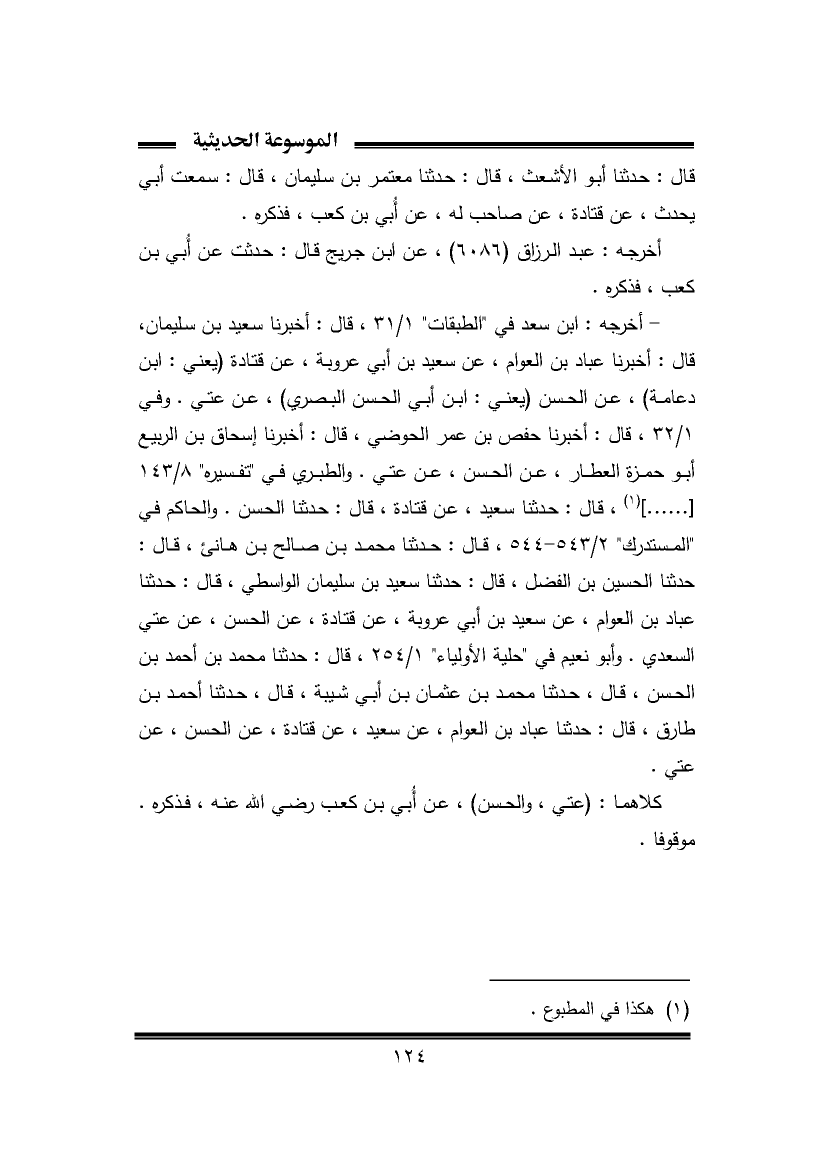 - أخرجه: ابن سعد في "الطبقات" ١/ ٣١، قال: أخبرنا سعيد بن سليمان، قال: أخبرنا عباد بن العوام، عن سعيد بن أبي عروبة، عن قتادة (يعني: ابن دعامة)، عن الحسن (يعني: ابن أبي الحسن البصري)، عن عتي. وفي ٣٢/ ١، قال: أخبرنا حفص بن عمر الحوضي، قال: أخبرنا إسحاق بن الربيع أبو حمزة العطار، عن الحسن، عن عتي. والطبري في "تفسيره" ٨/ ١٤٣ [ ...... ] (¬١)، قال: حَدَّثَنَا سعيد، عن قتادة، قال: حَدَّثَنَا الحسن. والحاكم في "المستدرك" ٢/ ٥٤٣ - ٥٤٤، قال: حَدَّثَنَا محمد بن صالح بن هانئ، قال: حَدَّثَنَا الحسين بن الفضل، قال: حَدَّثَنَا سعيد بن سليمان الواسطي، قال: حَدَّثَنَا عباد بن العوام، عن سعيد بن أبي عروبة، عن قتادة، عن الحسن، عن عتي السعدي. وأبو نعيم في "حلية الأولياء" ١/ ٢٥٤، قال: حَدَّثَنَا محمد بن أحمد بن الحسن، قال، حَدَّثَنَا محمد بن عثمان بن أبي شيبة، قال، حَدَّثَنَا أحمد بن طارق، قال: حَدَّثَنَا عباد بن العوام، عن سعيد، عن قتادة، عن الحسن، عن عتي.