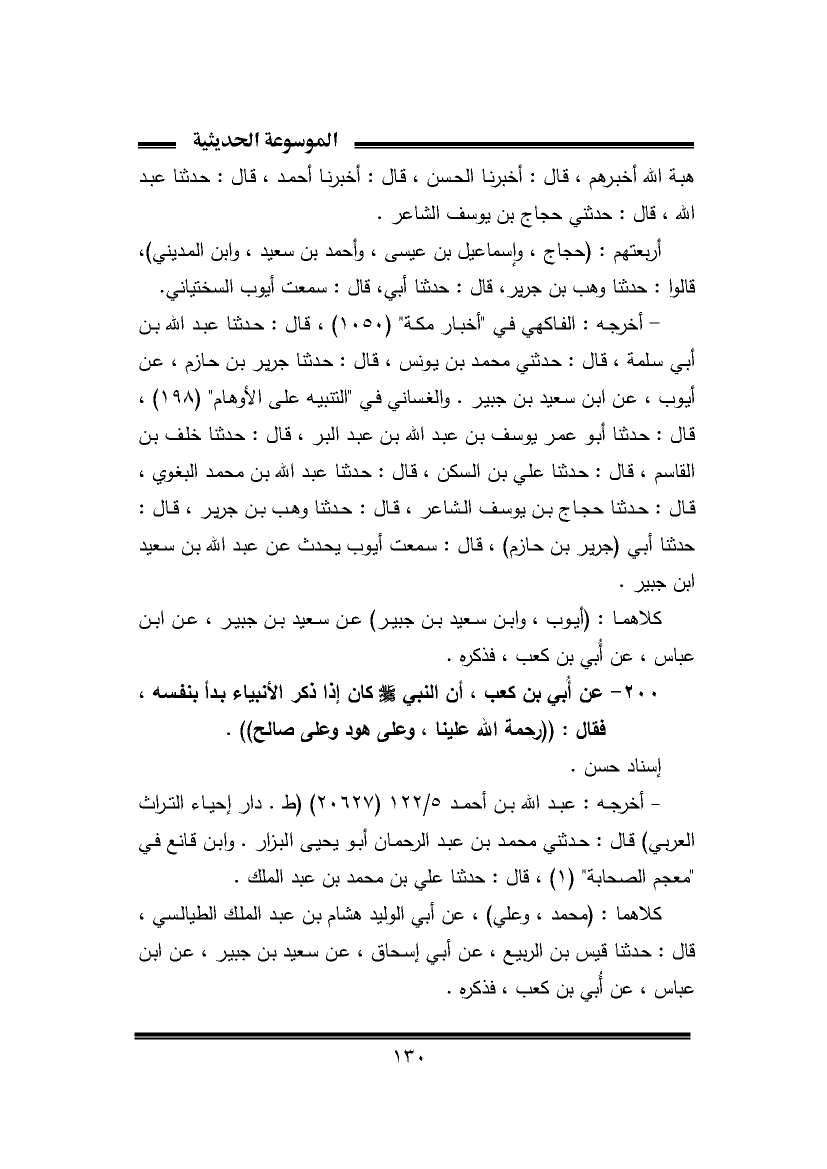 ٢٠٠ - عن أُبي بن كعب، أن النَّبِيّ - صلى الله عليه وسلم - كان إذا ذكر الأنبياء بدأ بنفسه، فقال: "رحمة اللّه علينا، وعلى هود وعلى صالح".