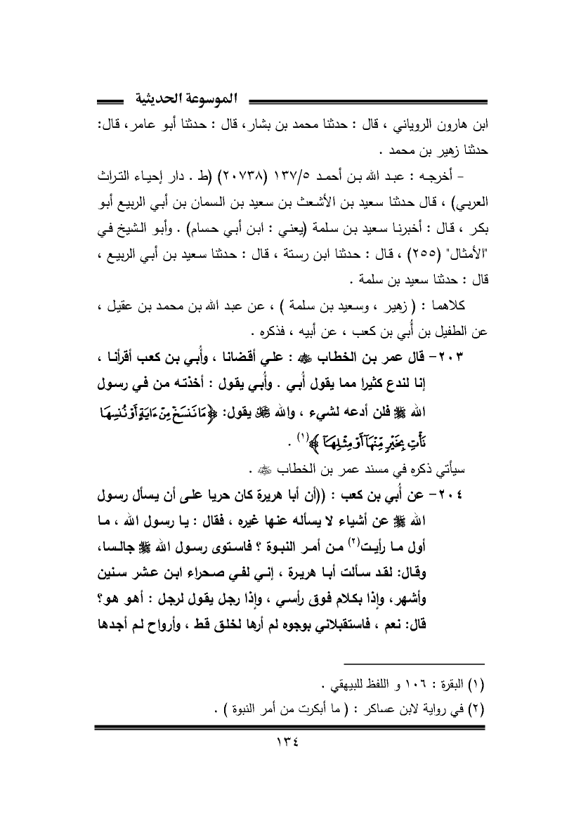 ٢٠٤ - عن أُبي بن كعب: "أن أبا هريرة كان حريا على أن يسأل رسول اللّه - صلى الله عليه وسلم - عن أشياء لا يسأله عنها غيره، فقال: يا رسول اللّه، ما أول ما رأيت (¬٢) من أمر النبوة؟ فاستوى رسول اللّه - صلى الله عليه وسلم - جالسا، وقال: لقد سألت أبا هريرة، إني لفي صحراء ابن عشر سنين وأشهر، وإذا بكم فوق رأسي، وإذا رجل يقول لرجل: أهو هو؟ قال: نعم، فاستقبلاني بوجوه لم أرها لخلق قط، وأرواح لم أجدها