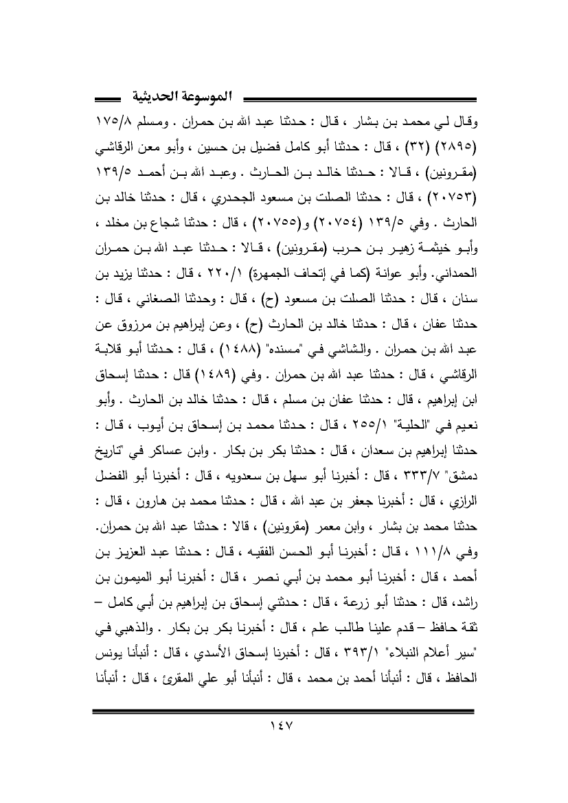 وقال لي محمد بن بشار، قال: حَدَّثَنَا عبد الله بن حمران. ومسلم ٨/ ١٧٥ (٢٨٩٥) (٣٢)، قال: حَدَّثَنَا أبو كامل فضيل بن حسين، وأبو معن الرقاشي (مقرونين)، قالا: حَدَّثَنَا خالد بن الحارث. وعبد الله بن أحمد ٥/ ١٣٩ (٢٠٧٥٣)، قال: حَدَّثَنَا الصلت بن مسعود الجحدري، قال: حَدَّثَنَا خالد بن الحارث. وفي ٥/ ١٣٩ (٢٠٧٥٤) و (٢٠٧٥٥)، قال: حَدَّثَنَا شجاع بن مخلد، وأبو خيثمة زهير بن حرب (مقرونين)، قالا: حَدَّثَنَا عبد الله بن حمران الحمداني. وأبو عوانة (كما في إتحاف الجمهرة) ١/ ٢٢٠، قال: حَدَّثَنَا يزيد بن سنان، قال: حَدَّثَنَا الصلت بن مسعود (ح)، قال: وحدثنا الصغاني، قال: حَدَّثَنَا عفان، قال: حَدَّثَنَا خالد بن الحارث (ح)، وعن إبراهيم بن مرزوق عن عبد الله بن حمران. والشاشي في "مسنده" (١٤٨٨)، قال: حَدَّثَنَا أبو قلابة الرقاشي، قال: حَدَّثَنَا عبد الله بن حمران. وفي (١٤٨٩) قال: حَدَّثَنَا إسحاق بن إبراهيم، قال: حَدَّثَنَا عفان بن مسلم، قال: حَدَّثَنَا خالد بن الحارث. وأبو نعيم في "الحلية" ١/ ٢٥٥، قال: حَدَّثَنَا محمد بن إسحاق بن أيوب، قال: حَدَّثَنَا إبراهيم بن سعدان، قال: حَدَّثَنَا بكر بن بكار. وابن عساكر في "تاريخ دمشق" ٧/ ٣٣٣، قال: أخبرنا أبو سهل بن سعدويه، قال: أخبرنا أبو الفضل الرازي، قال: أخبرنا جعفر بن عبد الله، قال: حَدَّثَنَا محمد بن هارون، قال: حَدَّثَنَا محمد بن بشار، وابن معمر (مقرونين)، قالا: حَدَّثَنَا عبد الله بن حمران. وفي ٨/ ١١١، قال: أخبرنا أبو الحسن الفقيه، قال: حَدَّثَنَا عبد العزيز بن أحمد، قال: أخبرنا أبو محمد بن أبي نصر، قال: أخبرنا أبو الميمون بن راشد، قال: حَدَّثَنَا أبو زرعة، قال: حدثني إسحاق بن إبراهيم بن أبي كامل - ثقة حافظ - قدم علينا طالب علم، قال: أخبرنا بكر بن بكار. والذهبي في "سير أعلام النبلاء" ١/ ٣٩٣، قال: أخبرنا إسحاق الأسدي، قال: أنبأنا يونس الحافظ، قال: أنبأنا أحمد بن محمد، قال: أنبأنا أبو علي المقرئ، قال: أنبأنا