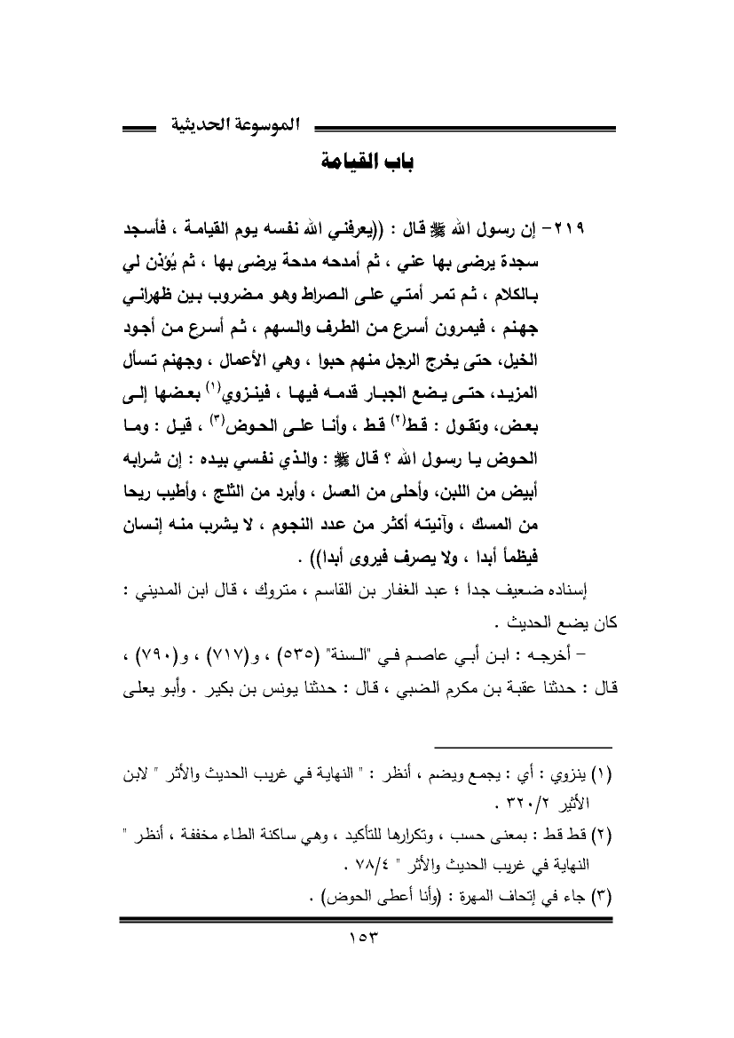 ٢١٩ - إن رسول اللّه - صلى الله عليه وسلم - قال: "يعرفني اللّه نفسه يوم القيامة، فأسجد سجدة يرضى بها عني، ثم أمدحه مدحة يرضى بها، ثم يُؤذن لي بالكلام، ثم تمر أمتي على الصراط وهو مضروب بين ظهراني جهنم، فيمرون أسرع من الطرف والسهم، ثم أسرع من أجود الخيل، حتى يخرج الرجل منهم حبوا، وهي الأعمال، وجهنم تسأل المزيد، حتى يضع الجبار قدمه فيها، فينزوي (¬١) بعضها إلى بعض، وتقول: قط (¬٢) قط، وأنا على الحوض (¬٣)، قيل: وما الحوض يا رسول اللّه؟ قال - صلى الله عليه وسلم -: والذي نفسي بيده: إن شرابه أبيض من اللبن، وأحلى من العسل، وأبرد من الثلج، وأطيب ريحا من المسك، وآنيته أكثر من عدد النجوم، لا يشرب منه إنسان فيظمأ أبدا، ولا يصرف فيروى أبدا".
