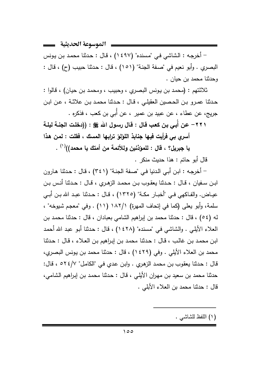 - أخرجه: الشاشي في "مسنده" (١٤٩٧)، قال: حَدَّثَنَا محمد بن يونس البصري. وأبو نعيم في "صفة الجنة" (١٥١)، قال: حَدَّثَنَا حبيب (ح)، قال: وحدثنا محمد بن حيان.