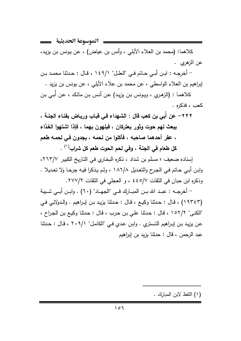 ٢٢٢ - عن أُبي بن كعب قال: الشهداء في قباب ورياض بفناء الجنة، يبعث لهم حوت وثور يعتركان، فيلهون بهما، فإذا اشتهوا الغذاء، عقر أحدهما صاحبه، فأكلوا من لحمه، يجدون في لحمه طعم كل طعام في الجنة، وفي لحم الحوت طعم كل شراب (¬١).