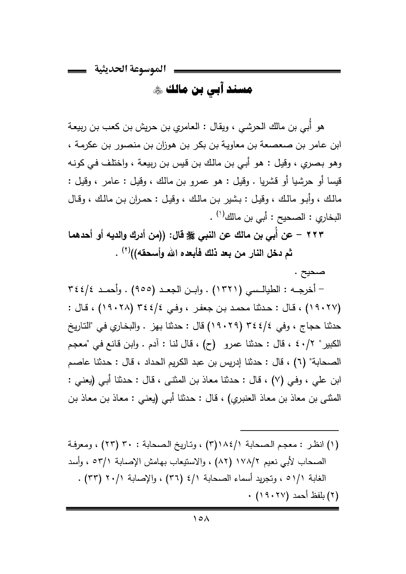 ٢٢٣ - عن أُبي بن مالك عن النَّبِيّ - صلى الله عليه وسلم - قال: "من أدرك والديه أو أحدهما ثم دخل النار من بعد ذلك فأبعده اللّه وأسحقه" (¬٢).