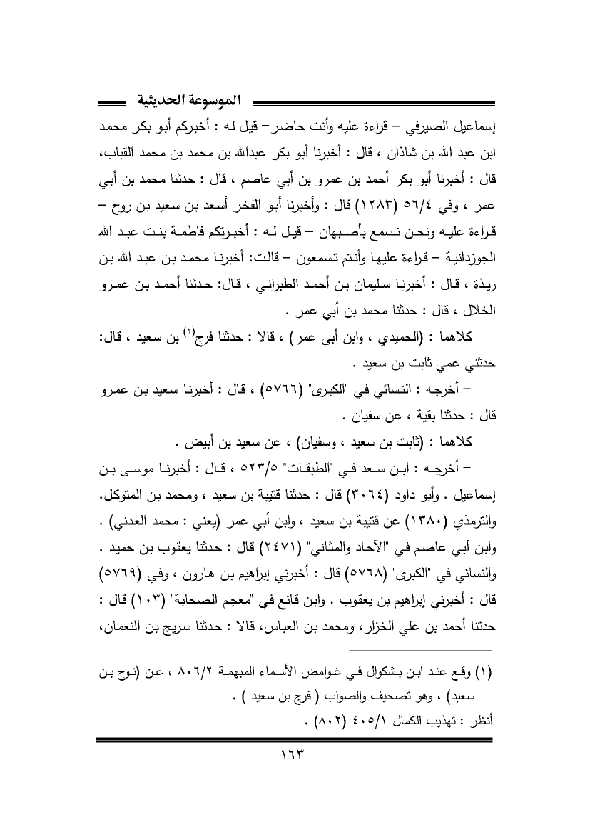 إسماعيل الصيرفي - قراءة عليه وأنت حاضر - قيل له: أخبركم أبو بكر محمد بن عبد الله بن شاذان، قال: أخبرنا أبو بكر عبد الله بن محمد بن محمد القباب، قال: أخبرنا أبو بكر أحمد بن عمرو بن أبي عاصم، قال: حَدَّثَنَا محمد بن أبي عمر، وفي ٤/ ٥٦ (١٢٨٣) قال: وأخبرنا أبو الفخر أسعد بن سعيد بن روح - قراءة عليه ونحن نسمع بأصبهان - قيل له: أخبرتكم فاطمة بنت عبد الله الجوزدانية - قراءة عليها وأنتم تسمعون - قالت: أخبرنا محمد بن عبد الله بن ريذة، قال: أخبرنا سليمان بن أحمد الطَّبراني، قال: حَدَّثَنَا أحمد بن عمرو الخلال، قال: حَدَّثَنَا محمد بن أبي عمر.