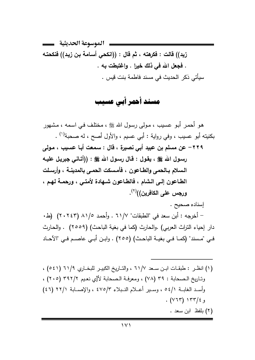 ٢٢٩ - عن مسلم بن عبيد أبي نصيرة، قال: سمعت أبا عسيب، مولى رسول الله - صلى الله عليه وسلم -، يقول: قال رسول الله - صلى الله عليه وسلم -: "أتاني جبريل عليه السلام بالحمى والطاعون، فأمسكت الحمى بالمدينة، وأرسلت الطاعون إلى الشام، فالطاعون شهادة لأمتي، ورحمة لهم، ورجس على الكافرين" (¬٢).