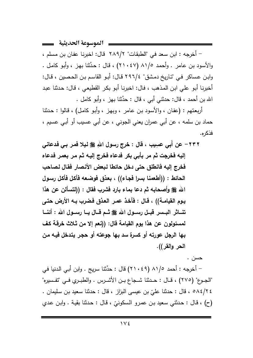 ٢٣٢ - عن أَبي عسِيب، قال: خرج رسول اللهِ - صلى الله عليه وسلم - ليلا فمر بي فدعاني إليه فخرجت ثم مر بأبي بكر فدعاه فخرج إليه ثم مر بعمر فدعاه فخرج إليه فانطلق حتى دخل حائطا لبعض الأنصار فقال لصاحب الحائط: "أطعمنا بسرا فجاء"، بعذق فوضعه فأكل فأكل رسول الله وأصحابه ثم دعا بماء بارد فشرب فقال: "لتسألن عن هذا يوم القيامة"، قال: فأخذ عمر العذق فضرب به الأرض حتى تناثر البسر قبل رسول الله - صلى الله عليه وسلم - ثم قال يا رسول الله: أئنا لمسئولون عن هذا يوم القيامة قال: "نعم إلا من ثلاث خرقة كف بها الرجل عورته أو كسرة سد بها جوعته أو حجر يتدخل فيه من الحر والقر".