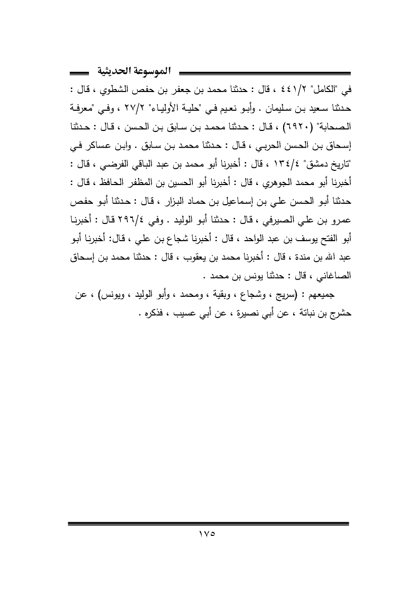 في "الكامل" ٢/ ٤٤١، قال: حدثنا محمد بن جعفر بن حفص الشطوي، قال: حدثنا سعيد بن سليمان. وأبو نعيم في "حلية الأولياء" ٢/ ٢٧، وفي "معرفة الصحابة" (٦٩٢٠)، قال: حدثنا محمد بن سابق بن الحسن، قال: حدثنا إسحاق بن الحسن الحربي، قال: حدثنا محمد بن سابق. وابن عساكر في "تاريخ دمشق" ٤/ ١٣٤، قال: أخبرنا أبو محمد بن عبد الباقي الفرضي، قال: أخبرنا أبو محمد الجوهري، قال: أخبرنا أبو الحسين بن المظفر الحافظ، قال: حدثنا أبو الحسن علي بن إسماعيل بن حماد البزار، قال: حدثنا أبو حفص عمرو بن علي الصيرفي، قال: حدثنا أبو الوليد. وفي ٤/ ٢٩٦ قال: أخبرنا أبو الفتح يوسف بن عبد الواحد، قال: أخبرنا شجاع بن علي، قال: أخبرنا أبو عبد الله بن مندة، قال: أخبرنا محمد بن يعقوب، قال: حدثنا محمد بن إسحاق الصاغاني، قال: حدثنا يونس بن محمد.
