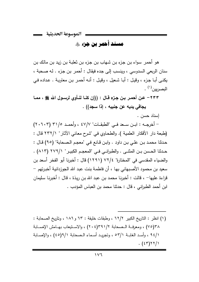 ٢٣٣ - عن أحمر بن جزء قال: "إن كنا لنأوي لرسول الله - صلى الله عليه وسلم -، مما يجافي يديه عن جنبيه، إذا سجد".