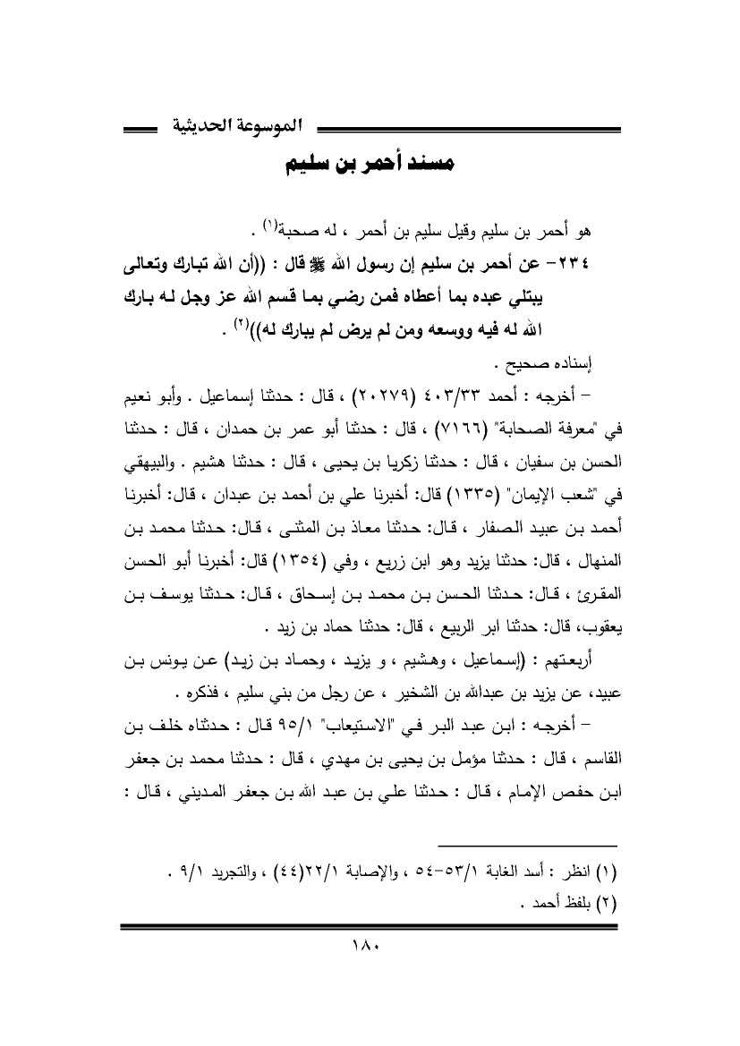 ٢٣٤ - عن أحمر بن سليم إن رسول الله - صلى الله عليه وسلم - قال: "أن الله تبارك وتعالى يبتلي عبده بما أعطاه فمن رضي بما قسم الله عز وجل له بارك الله له فيه ووسعه ومن لم يرض لم يبارك له" (¬٢).