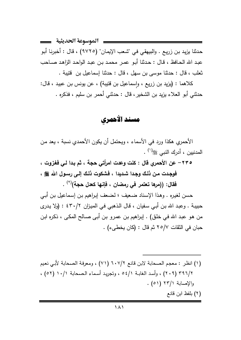 ٢٣٥ - عن الأحمري قال: كنت وعدت امرأتي حجة، ثم بدا لي فغزوت، فوجدت من ذلك وجدا شديدا، فشكوت ذلك إلى رسول الله - صلى الله عليه وسلم -، فقال: "مرها تعتمر في رمضان، فإنها كعدل حجة" (¬٢).