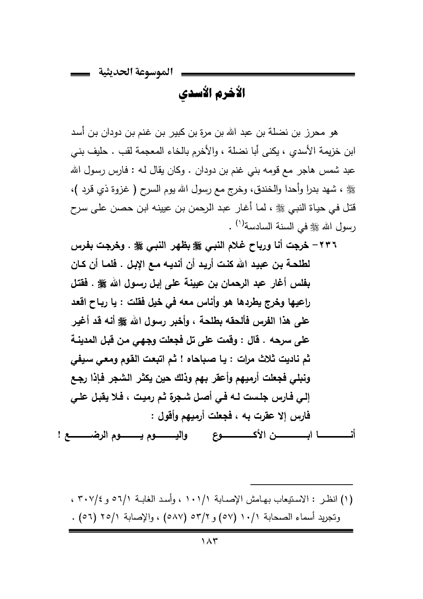 هو محرز بن نضلة بن عبد الله بن مرة بن كبير بن غنم بن دودان بن أسد بن خزيمة الأسدي، يكنى أبا نضلة، والأخرم بالخاء المعجمة لقب. حليف بني عبد شمس هاجر مع قومه بني غنم بن دودان. وكان يقال له: فارس رسول الله - صلى الله عليه وسلم -، شهد بدرا وأحدا والخندق، وخرج مع رسول الله يوم السرح (غزوة ذي قرد)، قتل في حياة النبي - صلى الله عليه وسلم -، لما أغار عبد الرحمن بن عيينة بن حصن على سرح رسول الله - صلى الله عليه وسلم - في السنة السادسة (¬١).