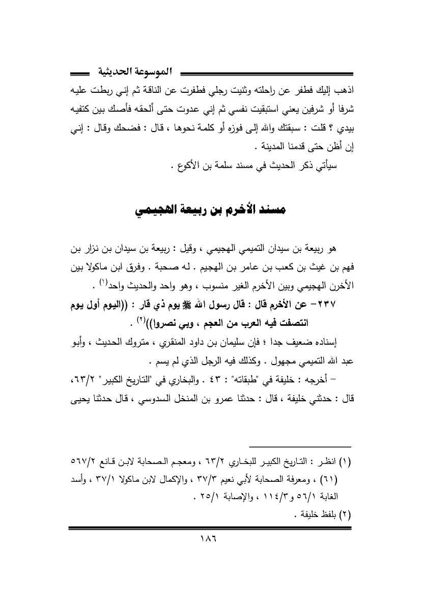 ٢٣٧ - عن الأخرم قال: قال رسول الله - صلى الله عليه وسلم - يوم ذي قار: "اليوم أول يوم انتصفت فيه العرب من العجم، وبي نصروا" (¬٢).