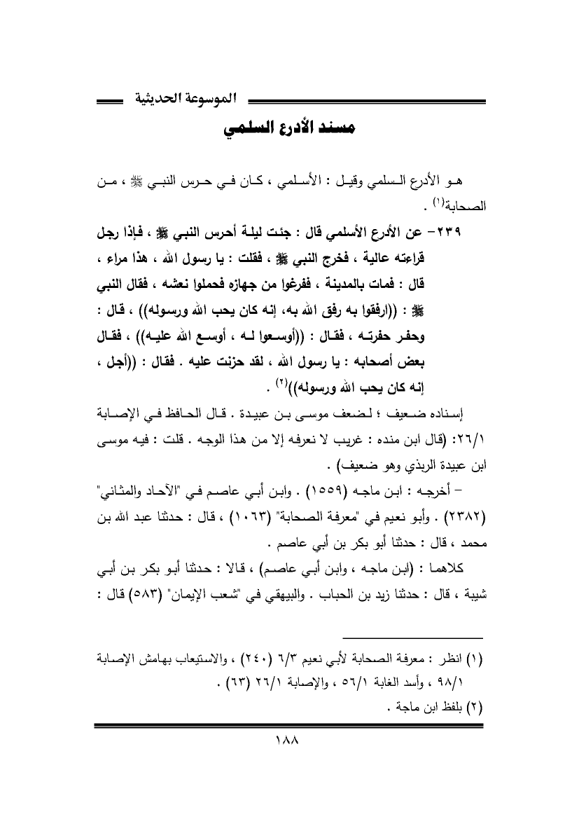 ٢٣٩ - عن الأدرع الأسلمي قال: جئت ليلة أحرس النبي - صلى الله عليه وسلم -، فإذا رجل قراءئه عالية، فخرج النبي - صلى الله عليه وسلم -، فقلت: يا رسول الله، هذا مراء، قال: فمات بالمدينة، ففرغوا من جهازه فحملوا نعشه، فقال النبي - صلى الله عليه وسلم -:"ارفقوا به رفق الله به، إنه كان يحب الله ورسوله"، قال: وحفر حفرته، فقال: "أوسعوا له، أوسع الله عليه"، فقال بعض أصحابه: يا رسول الله، لقد حزنت عليه. فقال: "أجل، إنه كان يحب الله ورسوله" (¬٢).