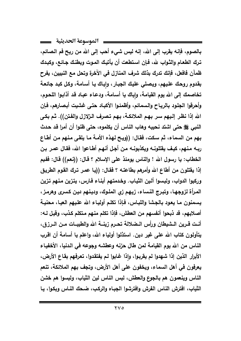 بالصوم، فإنه يقرب إلى اللّه، إنه ليس شيء أحب إلى اللّه من ريح فم الصائم، ترك الطعام والثواب للّه، فإن استطعت أن يأتيك الموت ويطنك جائع، وكبدك ظمآن فافعل، فإنك تدرك بذلك شرف المنازل في الآخرة وتحل مع النبيين، يفرح بقدوم روحك عليهم، ويصلي عليك الجبار، وإياك يا أسامة، وكل كبد جائعة تخاصمك إلى اللّه يوم القيامة، وإياك يا أسامة، ودعاء عباد قد أذابوا اللحوم، وأحرقوا الجلود بالرياح والسمائم، وأظمئوا الأكباد حتى غشيت أبصارهم، فإن اللّه إذا نظر إليهم سر بهم الملائكة، بهم تصرف الزلازل والفتن". ثم بكى النبي - صلى الله عليه وسلم - حتى اشتد نحيبه وهاب الناس أن يكلموه، حتى ظنوا أن أمرا قد حدث بهم من السماء، ثم سكت، فقال: "ويح لهذه الأمة ما يلقى منهم من أطاع ربه منهم، كيف يقتلونه ويكذبونه من أجل أنهم أطاعوا اللّه، فقال عمر بن الخطاب: يا رسول اللّه! والناس يومئذ على الإسلام؟ قال: "نعم" قال: ففيم إذا يقتلون من أطاع اللّه وأمرهم بطاعته؟ فقال: "يا عمر ترك القوم الطريق وركبوا الدواب، ولبسوا ألين الثياب. وخدمتهم أبناء فارس، يتزين منهم تزين المرأة لزوجها، وتبرج النساء، زيهم زي الملوك، ودينهم دين كسرى وهرمز، يسمنون ما يعود بالجشا واللباس، فإذا تكلم أولياء اللّه عليهم العيا، محنية أصلابهم، قد ذبحوا أنفسهم من العطش، فإذا تكلم منهم متكلم كذب، وقيل له: أنت قرين الشيطان ورأس الضلالة تحرم زينة اللّه والطيبات من الرزق، يتأولون كتاب اللّه على غير دين. استذلوا أولياء اللّه، واعلم يا أسامة أن اقرب الناس من اللّه يوم القيامة لمن طال حزنه وعطشه وجوعه في الدنيا، الأخفياء الأبرار الذين إذا شهدوا لم يقربوا، وإذا غابوا لم يفتقدوا، تعرفهم بقاع الأرض، يعرفون في أهل السماء، ويخفون على أهل الأرض، وتجف بهم الملائكة، تنعم الناس وينعمون هم بالجوع والعطش، لبس الناس لين الثياب، ولبسوا هم خشن الثياب، افترش الناس الفرش وافترشوا الجباه والركب، ضحك الناس وبكوا، يا