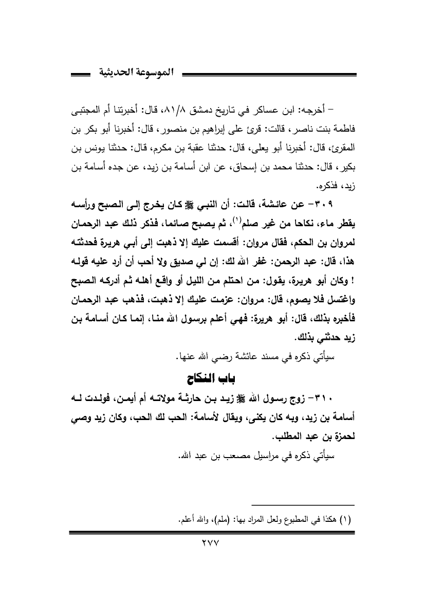 ٣٠٩ - عن عائشة، قالت: أن النبي - صلى الله عليه وسلم - كان يخرج إلى الصبح ورأسه يقطر ماء، نكاحا من غير صلم (¬١)، ثم يصبح صائما، فذكر ذلك عبد الرحمان لمروان بن الحكم، فقال مروان: أقسمت عليك إلا ذهبت إلى أبي هريرة فحدثته هذا، قال: عبد الرحمن: غفر اللّه لك: إن لي صديق ولا أحب أن أرد عليه قوله! وكان أبو هريرة، يقول: من احتلم من الليل أو واقع أهله ثم أدركه الصبح واغتسل فلا يصوم، قال: مروان: عزمت عليك إلا ذهبت، فذهب عبد الرحمان فأخبره بذلك، قال: أبو هريرة: فهي أعلم برسول اللّه منا، إنما كان أسامة بن زيد حدثني بذلك.