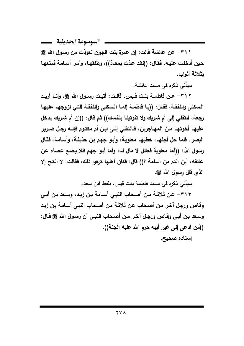 ٣١٣ - عن ثلاثة من أصحاب النبي أسامة بن زيد، وسعد بن أبي وقاص ورجل آخر من أصحاب عن ثلاثة من أصحاب النبي أسامة بن زيد وسعد بن أبي وقاص ورجل آخر من أصحاب النبي أن رسول اللّه - صلى الله عليه وسلم - قال: "من ادعى إلى غير أبيه حرم اللّه عليه الجنة".