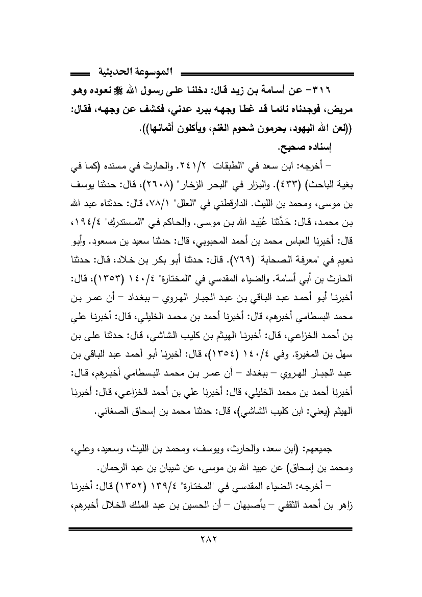 ٣١٦ - عن أسامة بن زيد قال: دخلنا على رسول اللّه - صلى الله عليه وسلم - نعوده وهو مريض، فوجدناه نائما قد غطا وجهه ببرد عدني، فكشف عن وجهه، فقال: "لعن اللّه اليهود، يحرمون شحوم الغنم، ويأكلون أثمانها".