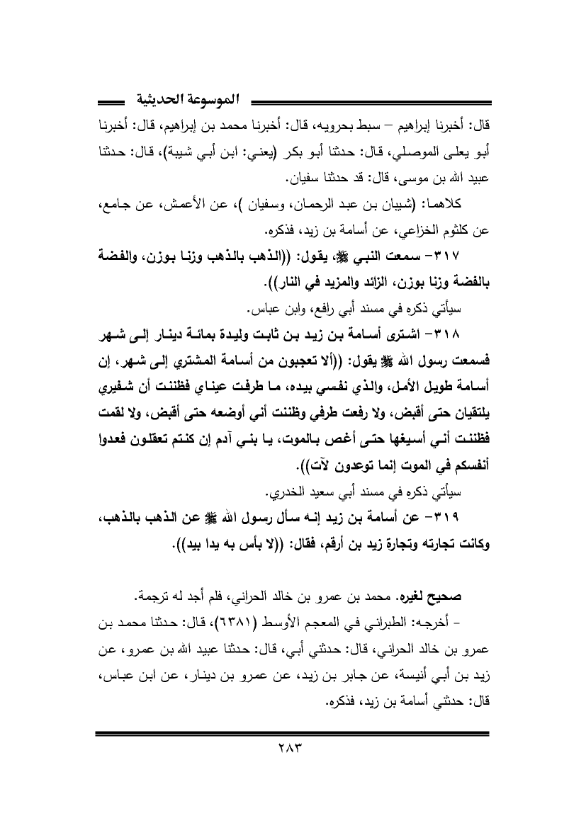 ٣١٩ - عن أسامة بن زيد إنه سأل رسول اللّه - صلى الله عليه وسلم - عن الذهب بالذهب، وكانت تجارته وتجارة زيد بن أرقم، فقال: "لا بأس به يدا بيد".