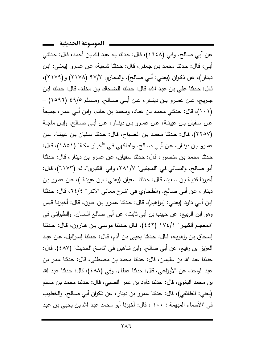 عن أبي صالح. وفي (١٦٤٨)، قال: حدثنا به عبد الله بن أحمد، قال: حدثني أبي، قال: حدثنا محمد بن جعفر، قال: حدثنا شعبة، عن عمرو (يعني: ابن دينار)، عن ذكوان (يعني: أبي صالح). والبخاري ٣/ ٩٧ (٢١٧٨) و (٢١٧٩)، قال: حدثنا علي بن عبد الله، قال: حدثنا الضحاك بن مخلد، قال: حدثنا ابن جريج، عن عمرو بن دينار، عن أبي صالح. ومسلم ٥/ ٤٩ (١٥٩٦) - (١٠١)، قال: حدثني محمد بن عباد، ومحمد بن حاتم، وابن أبي عمر، جميعًا عن سفيان بن عيينة، عن عمرو بن دينار، عن أبي صالح. وابن ماجة (٢٢٥٧)، قال: حدثنا محمد بن الصباح، قال: حدثنا سفيان بن عيينة، عن عمرو بن دينار، عن أبي صالح. والفاكهي في "أخبار مكة" (١٨٥١)، قال: حدثنا محمد بن منصور، قال: حدثنا سفيان، عن عمرو بن دينار، قال: حدثنا أبو صالح. والنسائي في "المجتبى" ٧/ ٢٨١، وفي "الكبرى"، له (٦١٧٣)، قال: أخبرنا قتيبة بن سعيد، قال: حدثنا سفيان (يعني: ابن عيينة)، عن عمرو بن دينار، عن أبي صالح. والطحاوي في "شرح معاني الآثار" ٤/ ٦٤، قال: حدثنا ابن أبي داود (يعني: إبراهيم)، قال: حدثنا عمرو بن عون، قال: أخبرنا قيس وهو ابن الربيع، عن حبيب بن أبي ثابت، عن أبي صالح السمان. والطبراني في "المعجم الكبير" ١/ ١٧٤ (٤٤٢)، قال حدثنا موسى بن هارون، قال: حدثنا إسحاق بن راهويه، قال: حدثنا يحيى بن آدم، قال: حدثنا إسرائيل، عن عبد العزيز بن رفيع، عن أبي صالح. وابن شاهين في "ناسخ الحديث" (٤٨٧)، قال: حدثنا عبد الله بن سليمان، قال: حدثنا محمد بن مصطفى، قال: حدثنا عمر بن عبد الواحد، عن الأوزاعي، قال: حدثنا عطاء. وفي (٤٨٨)، قال: حدثنا عبد الله بن محمد البغوي، قال: حدثنا داود بن عمر الضبي، قال: حدثنا محمد بن مسلم (يعني: الطائفي)، قال: حدثنا عمرو بن دينار، عن ذكوان أبي صالح. والخطيب في "الأسماء المبهمة": ١٠٠، قال: أخبرنا أبو محمد عبد الله بن يحيى بن عبد