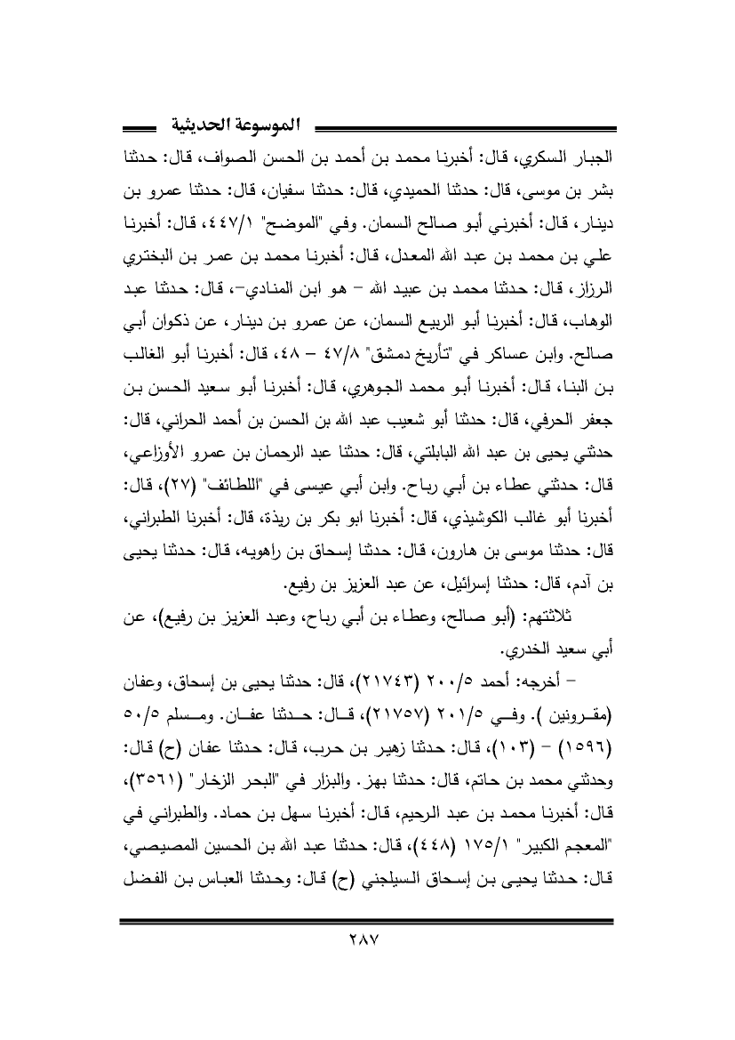 الجبار السكري، قال: أخبرنا محمد بن أحمد بن الحسن الصواف، قال: حدثنا بشر بن موسى، قال: حدثنا الحميدي، قال: حدثنا سفيان، قال: حدثنا عمرو بن دينار، قال: أخبرني أبو صالح السمان. وفي "الموضح" ١/ ٤٤٧، قال: أخبرنا علي بن محمد بن عبد الله المعدل، قال: أخبرنا محمد بن عمر بن البختري الرزاز، قال: حدثنا محمد بن عبيد الله -هو ابن المنادي-، قال: حدثنا عبد الوهاب، قال: أخبرنا أبو الربيع السمان، عن عمرو بن دينار، عن ذكوان أبي صالح. وابن عساكر في "تأريخ دمشق" ٨/ ٤٧ - ٤٨، قال: أخبرنا أبو الغالب بن البنا، قال: أخبرنا أبو محمد الجوهري، قال: أخبرنا أبو سعيد الحسن بن جعفر الحرفي، قال: حدثنا أبو شعيب عبد الله بن الحسن بن أحمد الحراني، قال: حدثني يحيى بن عبد الله البابلتي، قال: حدثنا عبد الرحمان بن عمرو الأوزاعي، قال: حدثني عطاء بن أبي رباح. وابن أبي عيسى في "اللطائف" (٢٧)، قال: أخبرنا أبو غالب الكوشيذي، قال: أخبرنا أبو بكر بن ريذة، قال: أخبرنا الطبراني، قال: حدثنا موسى بن هارون، قال: حدثنا إسحاق بن راهويه، قال: حدثنا يحيى بن آدم، قال: حدثنا إسرائيل، عن عبد العزيز بن رفيع.