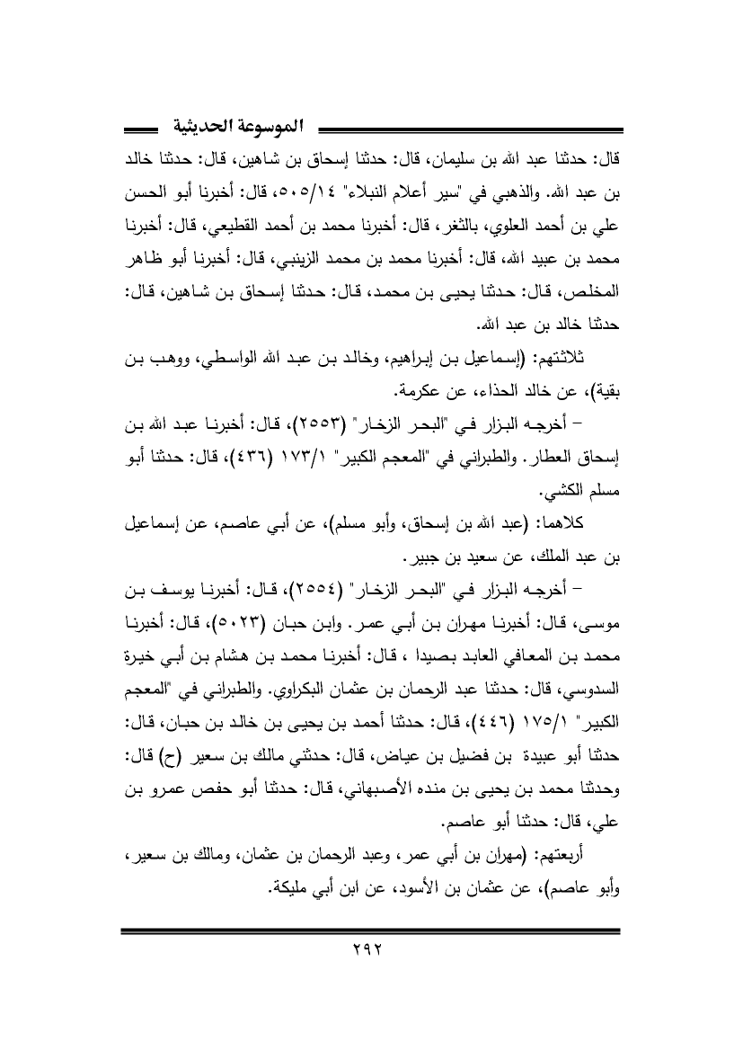 قال: حدثنا عبد الله بن سليمان، قال: حدثنا إسحاق بن شاهين، قال: حدثنا خالد بن عبد الله. والذهبي في "سير أعلام النبلاء" ١٤/ ٥٠٥، قال: أخبرنا أبو الحسن علي بن أحمد العلوي، بالثغر، قال: أخبرنا محمد بن أحمد القطيعي، قال: أخبرنا محمد بن عبيد الله، قال: أخبرنا محمد بن محمد الزينبي، قال: أخبرنا أبو ظاهر المخلص، قال: حدثنا يحيى بن محمد، قال: حدثنا إسحاق بن شاهين، قال: حدثنا خالد بن عبد الله.