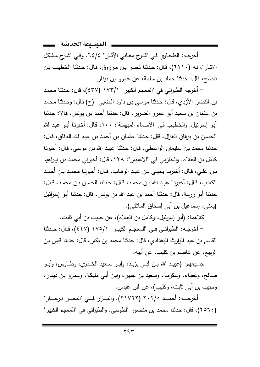- أخرجه: الطحاوي في "شرح معاني الآثار" ٤/ ٦٤. وفي "شرح مشكل الآثار"، له (٦١١٠)، قال: حدثنا نصر بن مرزوق، قال: حدثنا الخطيب بن ناصح، قال: حدثنا حماد بن سلمة، عن عمرو بن دينار.