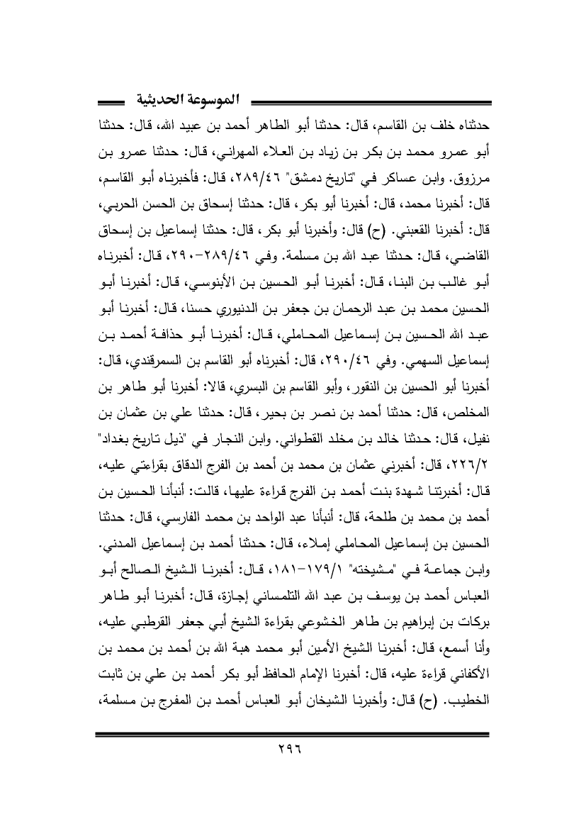 حدثناه خلف بن القاسم، قال: حدثنا أبو الطاهر أحمد بن عبيد الله، قال: حدثنا أبو عمرو محمد بن بكر بن زياد بن العلاء المهراني، قال: حدثنا عمرو بن مرزوق. وابن عساكر في "تاريخ دمشق" ٤٦/ ٢٨٩، قال: فأخبرناه أبو القاسم، قال: أخبرنا محمد، قال: أخبرنا أبو بكر، قال: حدثنا إسحاق بن الحسن الحربي، قال: أخبرنا القعبني. (ح) قال: وأخبرنا أبو بكر، قال: حدثنا إسماعيل بن إسحاق القاضي، قال: حدثنا عبد الله بن مسلمة. وفي ٤٦/ ٢٨٩ - ، ٢٩، قال: أخبرناه أبو غالب بن البنا، قال: أخبرنا أبو الحسين بن الأبنوسي، قال: أخبرنا أبو الحسين محمد بن عبد الرحمان بن جعفر بن الدنيوري حسنا، قال: أخبرنا أبو عبد الله الحسين بن إسماعيل المحاملي، قال: أخبرنا أبو حذافة أحمد بن إسماعيل السهمي. وفي ٤٦/ ٢٩٠، قال: أخبرناه أبو القاسم بن السمرقندي، قال: أخبرنا أبو الحسين بن النقور، وأبو القاسم بن البسري، قالا: أخبرنا أبو طاهر بن المخلص، قال: حدثنا أحمد بن نصر بن بحير، قال: حدثنا علي بن عثمان بن نفيل، قال: حدثنا خالد بن مخلد القطواني. وابن النجار في "ذيل تاريخ بغداد" ٢/ ٢٢٦، قال: أخبرني عثمان بن محمد بن أحمد بن الفرج الدقاق بقراءتي عليه، قال: أخبرتنا شهدة بنت أحمد بن الفرج قراءة عليها، قالت: أنبأنا الحسين بن أحمد بن محمد بن طلحة، قال: أنبأنا عبد الواحد بن محمد الفارسي، قال: حدثنا الحسين بن إسماعيل المحاملي إملاء، قال: حدثنا أحمد بن إسماعيل المدني. وابن جماعة في "مشيخته" ١/ ١٧٩ - ١٨١، قال: أخبرنا الشيخ الصالح أبو العباس أحمد بن يوسف بن عبد الله التلمساني إجازة، قال: أخبرنا أبو طاهر بركات بن إبراهيم بن طاهر الخشوعي بقراءة الشيخ أبي جعفر القرطبي عليه، وأنا أسمع، قال: أخبرنا الشيخ الأمين أبو محمد هبة الله بن أحمد بن محمد بن الأكفاني قراءة عليه، قال: أخبرنا الإمام الحافظ أبو بكر أحمد بن علي بن ثابت الخطيب. (ح) قال: وأخبرنا الشيخان أبو العباس أحمد بن المفرج بن مسلمة،