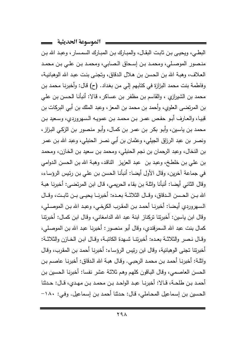 البطي، ويحيى بن ثابت البقال، والمبارك بن المبارك السمسار، وعبد الله بن منصور الموصلي، ومحمد بن إسحاق الصابي، ومحمد بن علي بن محمد العلاف، وهبة الله بن الحسن بن هلال الدقاق، وتجنى بنت عبد الله الوهبانية، وفاطمة بنت محمد البزازة في كتابهم إلي من بغداد. (ح) قال: وأخبرنا محمد بن محمد بن الشيرازي، والقاسم بن مظفر بن عساكر، قالا: أنبأنا الحسن بن علي بن المرتضى العلوي، وأحمد بن محمد بن المعز، وعبد الملك بن أبي البركات بن قبيا، والعارف أبو حفص عمر بن محمد بن عمويه السهروردي، وسعيد بن محمد بن ياسين، وأبو بكر بن عمر بن كمال، وأبو منصور بن الزكي البزاز، ونصر بن عبد الرزاق الجيلي، وعثمان بن أبي نصر الحنبلي، وعبد الله بن عمر بن النخال، وعبد الرحمان بن نجم الحنبلي، ومحمد بن سعيد بن الخازن، ومحمد بن علي بن خلطخ، وعبد بن عبد العزيز الناقد، وهبة الله بن الحسن الدوامي في جماعة آخرين، وقال الأول أيضا: أنبأنا الحسن بن علي بن رئيس الرؤساء، وقال الثاني أيضا: أنبأنا واثلة بن بقاء الحريمي، قال ابن المرتضى: أخبرنا هبة الله بن الحسن الدقاق، وقال الثلاثة بعده: أخبرنا يحيى بن ثابت، وقال السهروردي أيضا: أخبرنا أحمد بن المقرب الكرخي، وعبد الله بن الموصلي، وقال ابن ياسين: أخبرتنا تركناز ابنة عبد الله الدامغاني، وقال ابن كمال: أخبرتنا كمال بنت عبد الله السمرقندي، وقال أبو منصور: أخبرنا عبد الله بن الموصلي، وقال نصر والثلاثة بعده: أخبرتنا شهدة الكاتبة، وقال ابن الخازن والثلاثة: أخبرتنا تجنى الوهبانية، وقال ابن رئيس الرؤساء: أخبرنا أحمد بن المقرب، وقال واثلة: أخبرنا أحمد بن محمد الرحبي. وقال هبة الله الدقاق: أخبرنا عاصم بن الحسن العاصمي، وقال الباقون كلهم وهم ثلاثة عشر نفسا: أخبرنا الحسين بن أحمد بن طلحة، قالا: أخبرنا عبد الواحد بن محمد بن مهدي، قال: حدثنا الحسين بن إسماعيل المحاملي، قال: حدثنا أحمد بن إسماعيل. وفي: ١٨٠ -