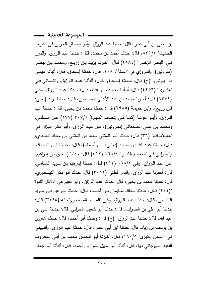 بن يحيى بن أبي عمر، قال: حدثنا عبد الرزاق. وأبو إسحاق الحربي في "غريب الحديث" ٢/ ٨٣١، قال: حدثنا أحمد بن محمد، قال: حدثنا عبد الرزاق. والبزار في "البحر الزخار" (٢٥٨٤) قال: أخبرنا يزيد بن زريع، ومحمد بن جعفر (مقرونين). والمروزي في "السنة": ١٠٨، قال: حدثنا إسحاق، قال: أنبأنا عيسى بن يونس. (ح) قال: حدثنا إسحاق، قال: أنبأنا عبد الرزاق. والنسائي في "الكبرى" (٤٢٥٦) قال: أنبأنا محمد بن رافع، قال: حدثنا عبد الرزاق. وفي (٦٣٧٩) قال: أخبرنا محمد بن عبد الأعلى الصنعاني، قال: حدثنا يزيد (يعني: ابن زريع). وابن خزيمة (٢٩٨٥) قال: حدثنا محمد بن يحيى، قال: حدثنا عبد الرزاق. وأبو عوانة (كما في إتحاف المهرة) ١/ ٧٠٣ (١٧٧) عن السلمي، ومحمد بن علي الصنعاني (مقرونين)، عن عبد الرزاق. وأبو بكر البزاز في "الغيلانيات" (٣٦) قال: حدثنا أبو المثنى معاذ بن المثنى بن معاذ العنبري، قال: حدثنا عبد الله بن محمد (يعني: ابن أسماء)، قال: أخبرنا ابن المبارك. والطبراني في "المعجم الكبير" ١/ ١٦٨ (٤١٢) قال: حدثنا إسحاق بن إبراهيم، عن عبد الرزاق. وفي ١/ ١٦٨ (٤١٣) قال: حدثنا إبراهيم بن سويد الشبامي، قال: أخبرنا عبد الرزاق. والدارقطني (٣٠١٢) قال: حدثنا أبو بكر النيسابوري، قال: حدثنا محمد بن يحيى، قال: حدثنا عبد الرزاق. وأبو نعيم في "دلائل النبوة " (٢٠٤) قال: حدثنا بذلك سليمان بن أحمد، قال: حدثنا إبراهيم بن سويد الشبامي، قال: حدثنا عبد الرزاق. وفي "المسند المستخرج"، له (٣١٤٥) قال: حدثنا أبو علي بن الصواف، قال: حدثنا أبو شعيب الحراني، قال: حدثنا علي بن عبد الله، قال: حدثنا عبد الرزاق. (ح) قال: وحدثنا أبو أحمد، قال: حدثنا هارون بن يوسف بن زياد، قال: حدثنا ابن أبي عمر، قال: حدثنا عبد الرزاق. والبيهقي في "السنن الكبرى" ٥/ ١٦٠، قال: أخبرنا أبو الحسن محمد بن أبي المعروف الفقيه المهرجاني بها، قال: أنبأنا أبو سهل بشر بن أحمد، قال: أنبأنا أبو جعفر