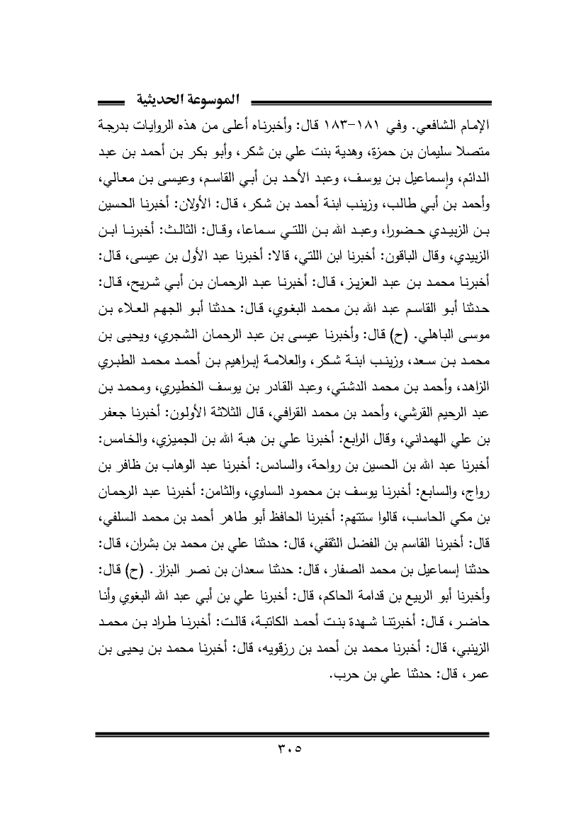 الإمام الشافعي. وفي ١٨١ - ١٨٣ قال: وأخبرناه أعلى من هذه الروايات بدرجة متصلا سليمان بن حمزة، وهدية بنت علي بن شكر، وأبو بكر بن أحمد بن عبد الدائم، وإسماعيل بن يوسف، وعبد الأحد بن أبي القاسم، وعيسى بن معالي، وأحمد بن أبي طالب، وزينب ابنة أحمد بن شكر، قال: الأولان: أخبرنا الحسين بن الزبيدي حضورا، وعبد الله بن اللتي سماعا، وقال: الثالث: أخبرنا ابن الزبيدي، وقال الباقون: أخبرنا ابن اللتي، قالا: أخبرنا عبد الأول بن عيسى، قال: أخبرنا محمد بن عبد العزيز، قال: أخبرنا عبد الرحمان بن أبي شريح، قال: حدثنا أبو القاسم عبد الله بن محمد البغوي، قال: حدثنا أبو الجهم العلاء بن موسى الباهلي. (ح) قال: وأخبرنا عيسى بن عبد الرحمان الشجري، ويحيى بن محمد بن سعد، وزينب ابنة شكر، والعلامة إبراهيم بن أحمد محمد الطبري الزاهد، وأحمد بن محمد الدشتي، وعبد القادر بن يوسف الخطيري، ومحمد بن عبد الرحيم القرشي، وأحمد بن محمد القرافي، قال الثلاثة الأولون: أخبرنا جعفر بن علي الهمداني، وقال الرابع: أخبرنا علي بن هبة الله بن الجميزي، والخامس: أخبرنا عبد الله بن الحسين بن رواحة، والسادس: أخبرنا عبد الوهاب بن ظافر بن رواج، والسابع: أخبرنا يوسف بن محمود الساوي، والثامن: أخبرنا عبد الرحمان بن مكي الحاسب، قالوا ستتهم: أخبرنا الحافظ أبو طاهر أحمد بن محمد السلفي، قال: أخبرنا القاسم بن الفضل الثقفي، قال: حدثنا علي بن محمد بن بشران، قال: حدثنا إسماعيل بن محمد الصفار، قال: حدثنا سعدان بن نصر البزاز. (ح) قال: وأخبرنا أبو الربيع بن قدامة الحاكم، قال: أخبرنا علي بن أبي عبد الله البغوي وأنا حاضر، قال: أخبرتنا شهدة بنت أحمد الكاتبة، قالت: أخبرنا طراد بن محمد الزينبي، قال: أخبرنا محمد بن أحمد بن رزقويه، قال: أخبرنا محمد بن يحيى بن عمر، قال: حدثنا علي بن حرب.