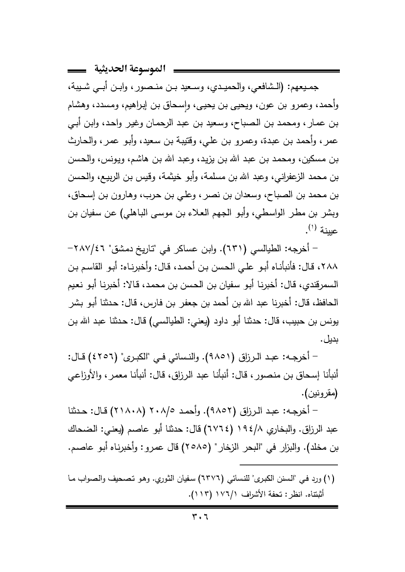 جميعهم: (الشافعي، والحميدي، وسعيد بن منصور، وابن أبي شيبة، وأحمد، وعمرو بن عون، ويحيى بن يحيى، وإسحاق بن إبراهيم، ومسدد، وهشام بن عمار، ومحمد بن الصباح، وسعيد بن عبد الرحمان وغير واحد، وابن أبي عمر، وأحمد بن عبدة، وعمرو بن علي، وقتيبة بن سعيد، وأبو عمر، والحارث بن مسكين، ومحمد بن عبد الله بن يزيد، وعبد الله بن هاشم، ويونس، والحسن بن محمد الزعفراني، وعبد الله بن مسلمة، وأبو خيثمة، وقيس بن الربيع، والحسن بن محمد بن الصباح، وسعدان بن نصر، وعلي بن حرب، وهارون بن إسحاق، وبشر بن مطر الواسطي، وأبو الجهم العلاء بن موسى الباهلي) عن سفيان بن عيينة (¬١).