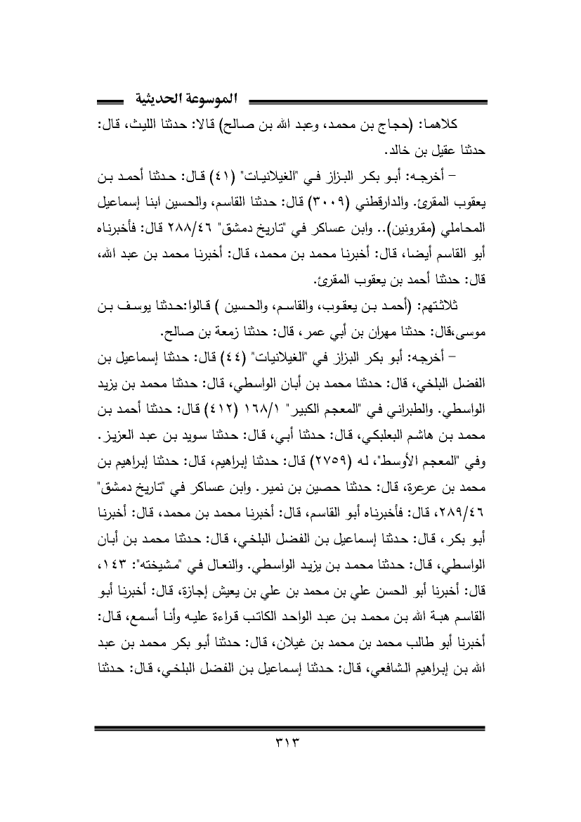 - أخرجه: أبو بكر البزاز في "الغيلانيات" (٤١) قال: حدثنا أحمد بن يعقوب المقرئ. والدارقطني (٣٠٠٩) قال: حدثنا القاسم، والحسين ابنا إسماعيل المحاملي (مقرونين) .. وابن عساكر في "تاريخ دمشق" ٤٦/ ٢٨٨ قال: فأخبرناه أبو القاسم أيضا، قال: أخبرنا محمد بن محمد، قال: أخبرنا محمد بن عبد الله، قال: حدثنا أحمد بن يعقوب المقرئ.