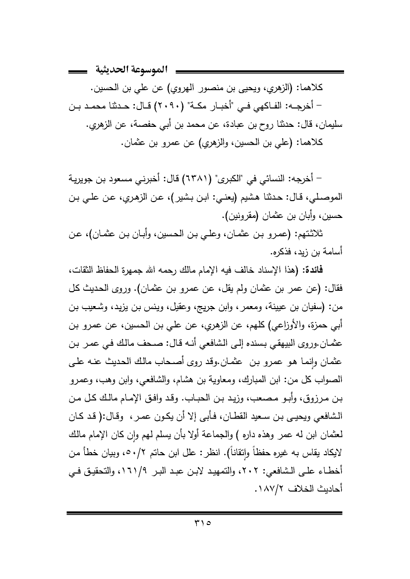 فائدة: (هذا الإسناد خالف فيه الإمام مالك رحمه الله جمهرة الحفاظ الثقات، فقال: (عن عمر بن عثمان ولم يقل، عن عمرو بن عثمان). وروى الحديث كل من: (سفيان بن عيينة، ومعمر، وابن جريج، وعقيل، وينس بن يزيد، وشعيب بن أبي حمزة، والأوزاعي) كلهم، عن الزهري، عن علي بن الحسين، عن عمرو بن عثمان. وروى البيهقي بسنده إلى الشافعي أنه قال: صحف مالك في عمر بن عثمان وإنما هو عمرو بن عثمان. وقد روى أصحاب مالك الحديث عنه على الصواب كل من: ابن المبارك، ومعاوية بن هشام، والشافعي، وابن وهب، وعمرو بن مرزوق، وأبو مصعب، وزيد بن الحباب. وقد وافق الإمام مالك كل من الشافعي ويحيى بن سعيد القطان، فأبى إلا أن يكون عمر، وقال: (قد كان لعثمان ابن له عمر وهذه داره) والجماعة أولا بأن يسلم لهم وإن كان الإمام مالك لا يكاد يقاس به غيره حفظًا وإتقانًا). انظر: علل ابن حاتم ٢/ ٥٠، وييان خطأ من أخطاء على الشافعي: ٢٠٢، والتمهيد لابن عبد البر ٩/ ١٦١، والتحقيق في أحاديث الخلاف ٢/ ١٨٧.