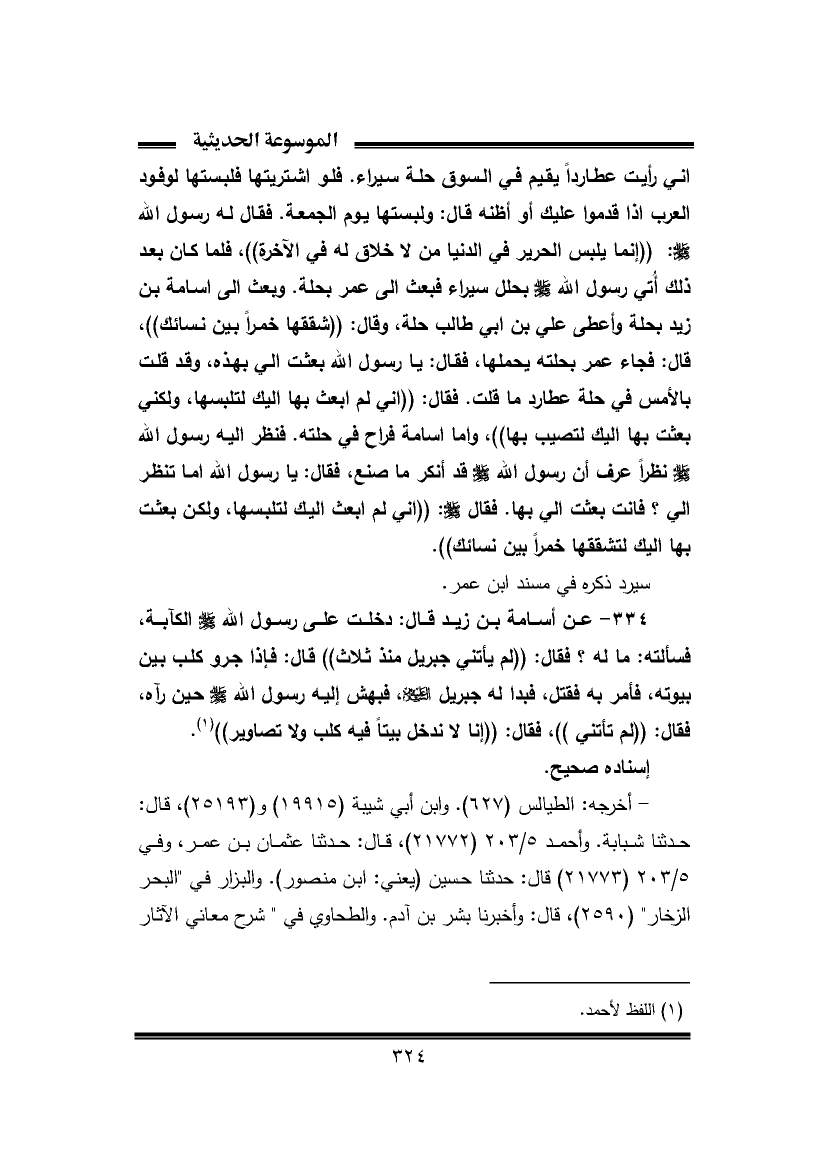 إني رأيت عطاردًا يقيم في السوق حلة سيراء. فلو اشتريتها فلبستها لوفود العرب إذا قدموا عليك أو أظنه قال: ولبستها يوم الجمعة. فقال له رسول الله -صَلَّى اللهُ عَلَيْهِ وَسَلَّمَ-: ((إنما يلبس الحرير في الدنيا من لا خلاق له في الآخرة))، فلما كان بعد ذلك أُتي رسول الله -صَلَّى اللهُ عَلَيْهِ وَسَلَّمَ- بحلل سيراء فبعث إلى عمر بحلة. وبعث إلى أسامة بن زيد بحلة وأعطى علي بن أبي طالب حلة، وقال: ((شققها خمرًا بين نسائك))، قال: فجاء عمر بحلته يحملها، فقال: يا رسول الله بعثت إلي بهذه، وقد قلت بالأمس في حلة عطارد ما قلت. فقال: ((إني لم أبعث بها إليك لتلبسها، ولكني بعثت بها إليك لتصيب بها))، وأما أسامة فراح في حلته. فنظر إليه رسول الله -صَلَّى اللهُ عَلَيْهِ وَسَلَّمَ- نظرًا عرف أن رسول الله -صَلَّى اللهُ عَلَيْهِ وَسَلَّمَ- قد أنكر ما صنع، فقال: يا رسول الله اما تنظر إلي؟ فأنت بعثت إلي بها. فقال -صَلَّى اللهُ عَلَيْهِ وَسَلَّمَ-: ((إني لم أبعث إليك لتلبسها، ولكن بعثت بها إليك لتشققها خمرًا بين نسائك)).