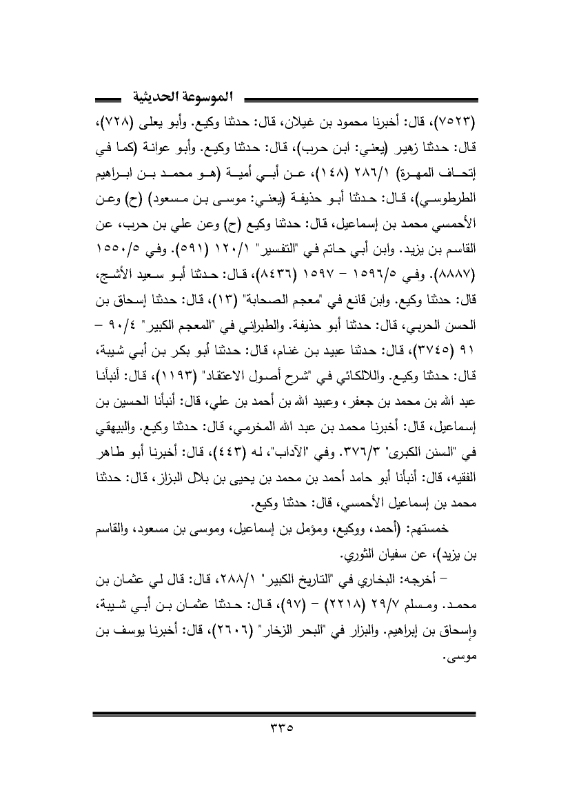 (٧٥٢٣)، قال: أخبرنا محمود بن غيلان، قال: حدثنا وكيع. وأبو يعلى (٧٢٨)، قال: حدثنا زهير (يعني: ابن حرب)، قال: حدثنا وكيع. وأبو عوانة (كما في إتحاف المهرة) ١/ ٢٨٦ (١٤٨)، عن أبي أمية (هو محمد بن إبراهيم الطرطوسي)، قال: حدثنا أبو حذيفة (يعني: موسى بن مسعود) (ح) وعن الأحمسي محمد بن إسماعيل، قال: حدثنا وكيع (ح) وعن علي بن حرب، عن القاسم بن يزيد. وابن أبي حاتم في "التفسير" ١/ ١٢٠ (٥٩١). وفي ٥/ ١٥٥٠ (٨٨٨٧). وفي ٥/ ١٥٩٦ - ١٥٩٧ (٨٤٣٦)، قال: حدثنا أبو سعيد الأشج، قال: حدثنا وكيع. وابن قانع في "معجم الصحابة" (١٣)، قال: حدثنا إسحاق بن الحسن الحربي، قال: حدثنا أبو حذيفة. والطبراني في "المعجم الكبير" ٤/ ٩٠ - ٩١ (٣٧٤٥)، قال: حدثنا عبيد بن غنام، قال: حدثنا أبو بكر بن أبي شيبة، قال: حدثنا وكيع. واللالكائي في "شرح أصول الاعتقاد" (١١٩٣)، قال: أنبأنا عبد الله بن محمد بن جعفر، وعبيد الله بن أحمد بن علي، قال: أنبأنا الحسين بن إسماعيل، قال: أخبرنا محمد بن عبد الله المخرمي، قال: حدثنا وكيع. والبيهقي في "السنن الكبرى" ٣/ ٣٧٦. وفي "الآداب"، له (٤٤٣)، قال: أخبرنا أبو طاهر الفقيه، قال: أنبأنا أبو حامد أحمد بن محمد بن يحيى بن بلال البزاز، قال: حدثنا محمد بن إسماعيل الأحمسي، قال: حدثنا وكيع.