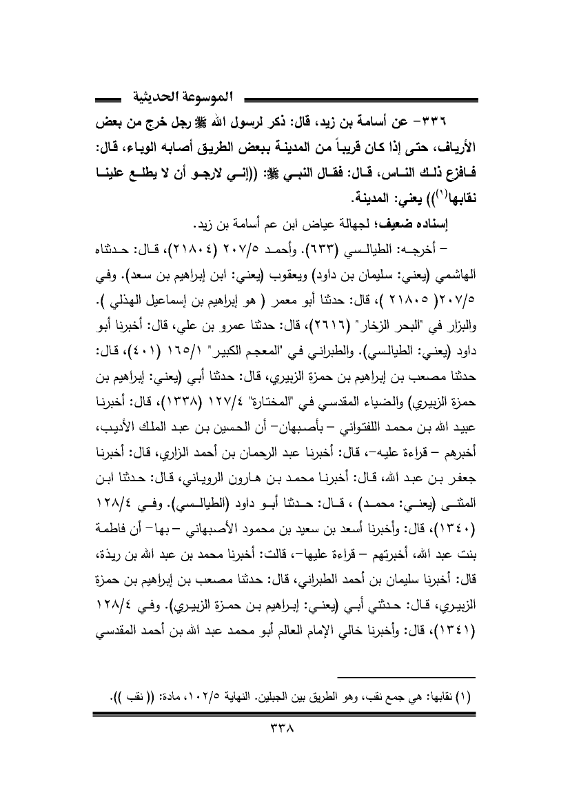 ٣٣٦ - عن أسامة بن زيد، قال: ذكر لرسول الله -صَلَّى اللهُ عَلَيْهِ وَسَلَّمَ- رجل خرج من بعض الأرياف، حتى إذا كان قريبًا من المدينة ببعض الطريق أصابه الوباء، قال: فأفزع ذلك الناس، قال: فقال النبي -صَلَّى اللهُ عَلَيْهِ وَسَلَّمَ-: "إني لأرجو أن لا يطلع علينا نقابها (¬١) " يعني: المدينة.