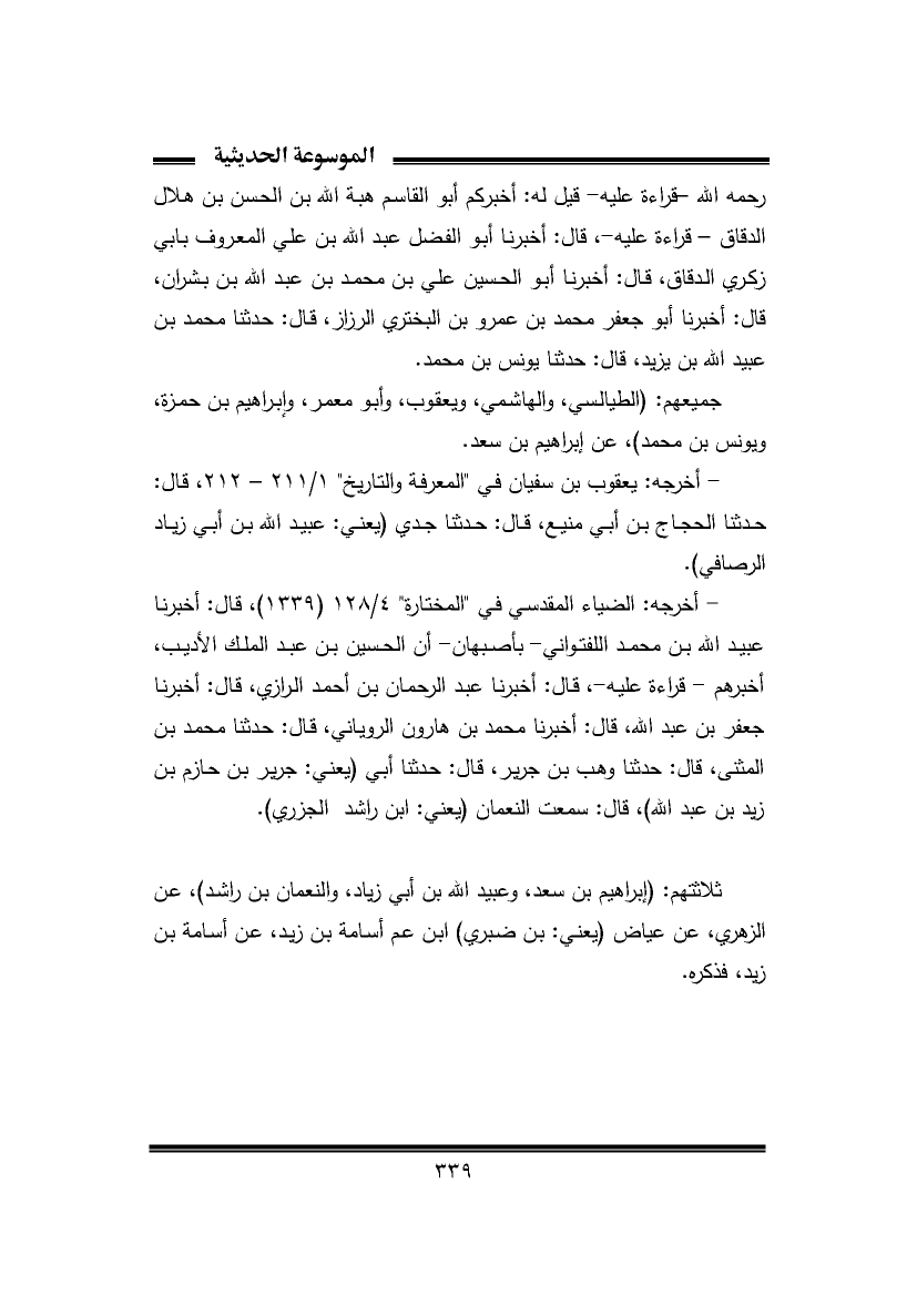 جميعهم: (الطيالسي، والهاشمي، ويعقوب، وأبو معمر، وإبراهيم بن حمزة، ويونس بن محمد)، عن إبراهيم بن سعد.