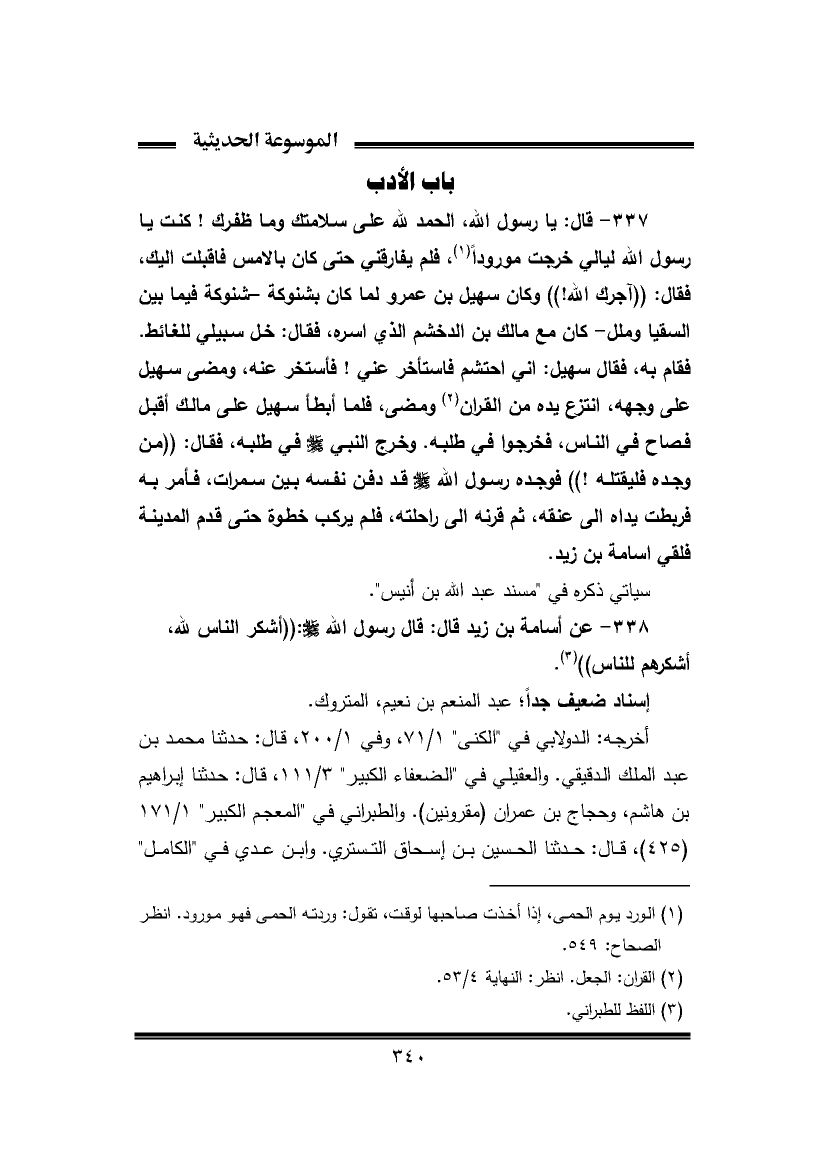 ٣٣٨ - عن أسامة بن زيد قال: قال رسول الله -صَلَّى اللهُ عَلَيْهِ وَسَلَّمَ-: ((أشكر الناس لله، أشكرهم للناس)) (¬٣).