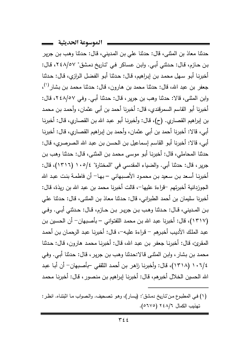 حدثنا معاذ بن المثنى، قال: حدثنا علي بن المديني، قال: حدثنا وهب بن جرير بن حازم، قال: حدثني أبي. وابن عساكر في "تاريخ دمشق" ٥٧/ ٢٤٨، قال: أخبرنا أبو سهل محمد بن إبراهيم، قال: حدثنا أبو الفضل الرازي، قال: حدثنا جعفر بن عبد الله، قال: حدثنا محمد بن هارون، قال: حدثنا محمد بن بشار (¬١)، وابن المثنى، قالا: حدثنا وهب بن جرير، قال: حدثنا أبي. وفي ٥٧/ ٢٤٨، قال: أخبرنا أبو القاسم السمرقندي، قال: أخبرنا أحمد بن أبي عثمان، وأحمد بن محمد بن إبراهيم القصاري. (ح)، قال: وأخبرنا أبو عبد الله بن القصاري، قال: أخبرنا أبي، قالا: أخبرنا أحمد بن أبي عثمان، وأحمد بن إبراهيم القصاري، قال: أخبرنا أبي، قالا: أخبرنا أبو القاسم إسماعيل بن الحسن بن عبد الله الصرصري، قال: حدثنا المحاملي، قال: أخبرنا أبو موسى محمد بن المثنى، قال: حدثنا وهب بن جرير، قال: حدثنا أبي. والضياء المقدسي في "المختارة" ٤/ ١٠٥ (١٣١٦)، قال: أخبرنا أسعد بن سعيد بن محمود الأصبهاني -بها- أن فاطمة بنت عبد الله الجوزدانية أخبرتهم -قراءة عليها-، قالت أخبرنا محمد بن عبد الله بن ريذة، قال: أخبرنا سليمان بن أحمد الطبراني، قال: حدثنا معاذ بن المثنى، قال: حدثنا علي بن المديني، قال: حدثنا وهب بن جرير بن حازم، قال: حدثني أبي. وفي (١٣١٧)، قال: أخبرنا عبد الله بن محمد اللفتواني -بأصبهان- أن الحسين بن عبد الملك الأديب أخبرهم -قراءة عليه-، قال: أخبرنا عبد الرحمان بن أحمد المقرئ، قال: أخبرنا جعفر بن عبد الله، قال: أخبرنا محمد هارون، قال: حدثنا محمد بن بشار، وابن المثنى قالا: حدثنا وهب بن جرير، قال: حدثنا أبي. وفي ٤/ ١٠٦ (١٣١٨)، قال: وأخبرنا زاهر بن أحمد الثقفي -بأصبهان- أن أبا عبد الله الحسين الخلال أخبرهم، قال: أخبرنا إبراهيم بن منصور، قال: أخبرنا محمد