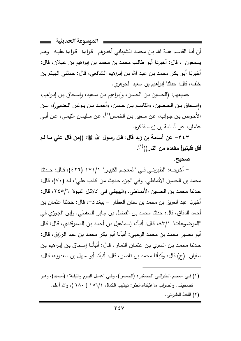 ٣٤٣ - عن أسامة بن زيد قال: قال رسول الله -صَلَّى اللهُ عَلَيْهِ وَسَلَّمَ-: ((من قال علي ما لم أقل فليتبوأ مقعده من النار)) (¬٢).