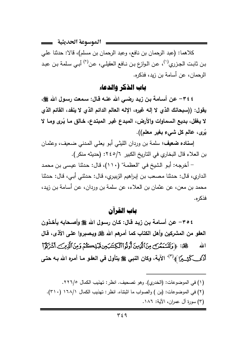 ٣٥٤ - عن أسامة بن زيد قال: كان رسول الله -صَلَّى اللهُ عَلَيْهِ وَسَلَّمَ- وأصحابه يأخذون العفو من المشركين وأهل الكتاب كما أمرهم الله -عَزَّ وَجَلَّ- ويصبروا على الأذى، قال الله -عَزَّ وَجَلَّ-: {وَلَتَسْمَعُنَّ مِنَ الَّذِينَ أُوتُوا الْكِتَابَ مِنْ قَبْلِكُمْ وَمِنَ الَّذِينَ أَشْرَكُوا أَذًى كَثِيرًا} (¬٣)، الآية، وكان النبي -صَلَّى اللهُ عَلَيْهِ وَسَلَّمَ- يتأول في العفو ما أمره الله به حتى