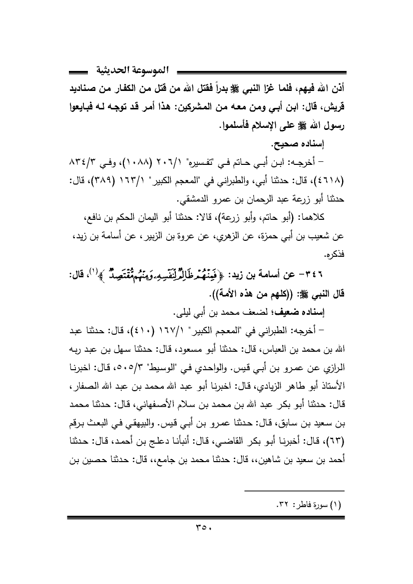 ٣٤٦ - عن أسامة بن زيد: {فَمِنْهُمْ ظَالِمٌ لِنَفْسِهِ وَمِنْهُمْ مُقْتَصِدٌ} (¬١)، قال: قال النبي -صَلَّى اللهُ عَلَيْهِ وَسَلَّمَ-: ((كلهم من هذه الأمة)).